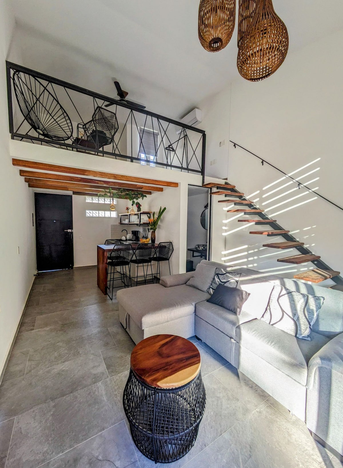 Casa Che Che te ofrece una vista increíble de la selva y grandes comodidades así como de un jacuzzi privado para que puedas relajarte al máximo y pasar unas vacaciones inolvidables; te incluimos junto con la renta de la propiedad el uso de un carrito de golf de forma GRATUITA para que puedas desplazarte dentro de Sayulita y puedas disfrutar al máximo tu estadía en un ambiente tranquilo y sumamente relajante. Ell loft mide 78! m2!