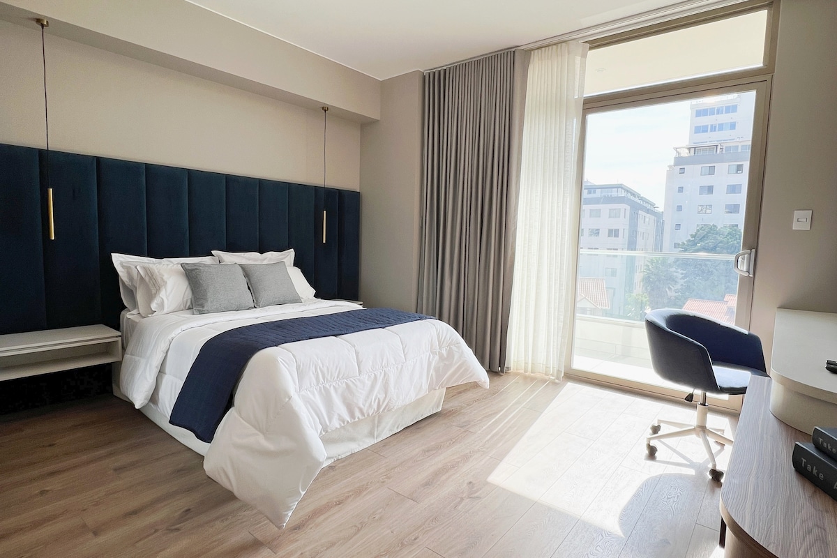 Apartamento de una suite, totalmente equipado y diseñado para su comodidad con distintas áreas como lavandería, cocina, living, y comedor. Así mismo cuenta con Aire Acondicionado, Internet WiFi, Alexa, Televisores Smart, Chromecast IPTv, con acceso a más de 400 canales de televisión y contenido de las principales plataformas de streaming. Contamos con seguridad privada, recepción y atención al cliente las 24 hrs. del día. Brindamos desayuno continental (opcional)