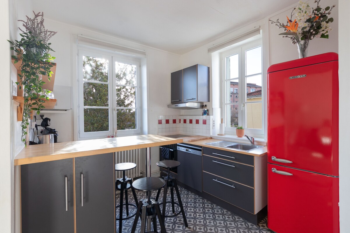 Cambie de aires en este apartamento del centro de la ciudad de Mâcon. Completamente renovado para hacerle viajar a las islas del Pacífico: pared vegetal, huevo suspendido, fregadero de madera… un verdadero nido para relajarse. Tendrá a su entera disposición 60 m2 que incluyen una sala de estar, una zona de lectura, un comedor, un aseo separado, una cocina y una suite principal con su baño de mármol verde. 🔐Llegada autónoma 🍬Extras Se proporciona🛌 ropa de cama y toallas ☕️ Cápsula Nespresso