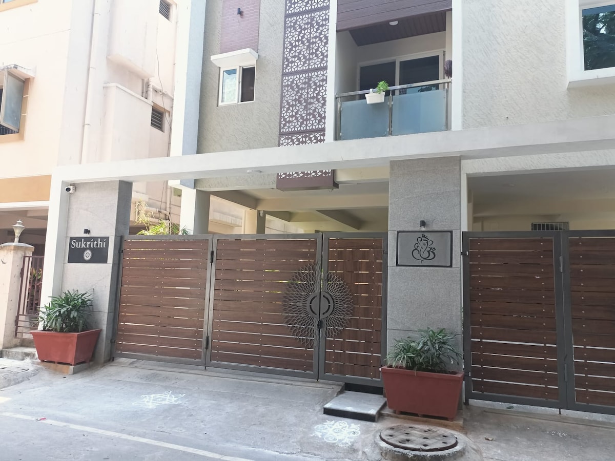 Nuestra encantadora suite de 2 dormitorios con acceso al ascensor, está totalmente amueblada y ubicada en un vecindario sereno y de lujo. Cuenta con una cocina totalmente equipada, acogedoras salas de estar y acogedoras habitaciones. Las comodidades modernas incluyen 40 Mbps Wifi, aire acondicionado de marca General, agua potable, TV inteligente de 47 pulgadas, respaldo de energía. Con una ubicación ideal, está a 15 minutos del aeropuerto, a 5 minutos del centro comercial Phoenix, del centro comercial chennai, del IIT, de la Universidad Anna, de los mejores hoteles y a 2 minutos del metro. Las parejas son bienvenidas. ¡Ubicación privilegiada y tranquila! 50 % de descuento en el spa