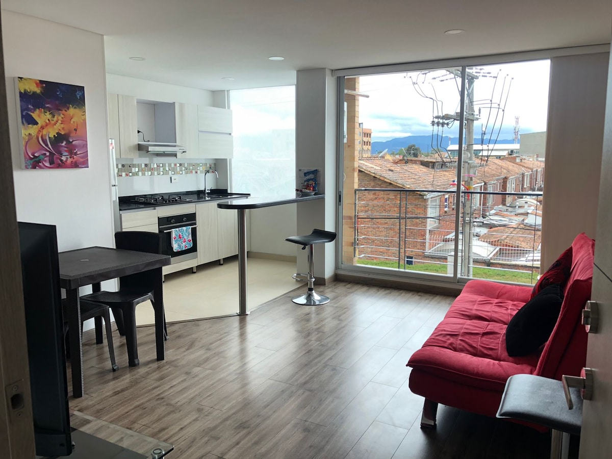 Estrena un apartamento nuevo, moderno y totalmente equipado y con secadora, perfecto para hasta 5 huéspedes. Ubicado en una tranquila zona residencial, este acogedor espacio ofrece una vista espectacular a las montañas, lavadora/secadora para mayor comodidad y un ambiente ideal tanto para descansar como para teletrabajar. Disfruta de un entorno seguro, tranquilo, aire puro y la paz que solo la sabana puede ofrecer, a pocos minutos de la ciudad y del centro historico.