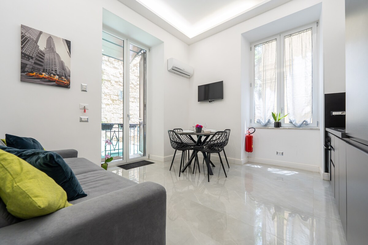 Departamento luminoso de 100 metros cuadrados recientemente renovado, situado en el tercer piso de un edificio antiguo sin ascensor, situado en el corazón de los barrios españoles, a pocos pasos del centro histórico. La casa consta de: 3 habitaciones dobles con baño privado, cocina/sala de estar común, lavandería con lavadora disponible para los huéspedes, terraza equipada con 130 metros cuadrados con cocina incorporada y acceso directo desde la casa y vistas a los tejados de Nápoles, el Vesubio y la Certosa de San Martino.
