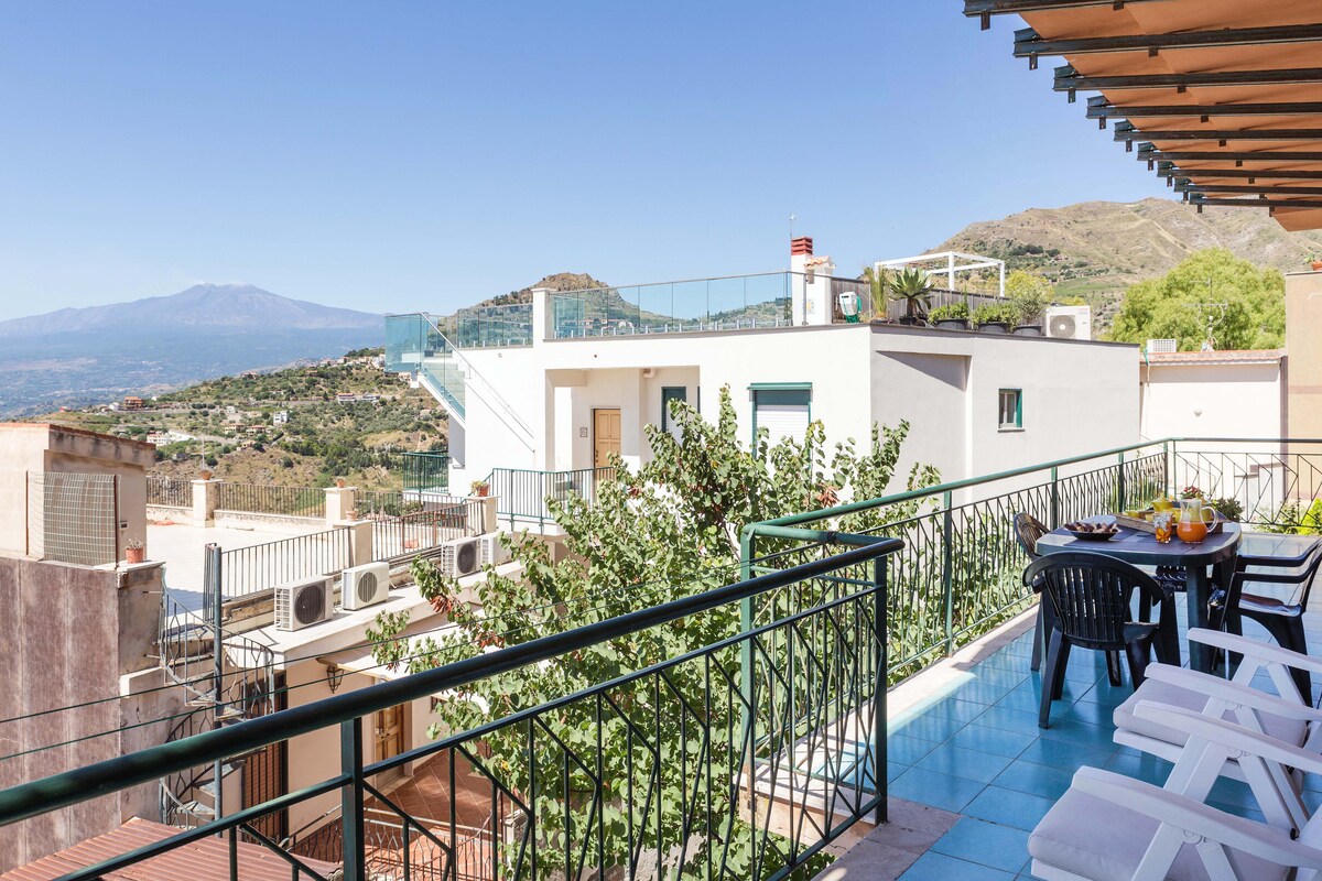 ENG El apartamento (130 m²) se encuentra en una zona residencial tranquila. El centro de la ciudad (es decir, Corso Umberto) está a 300 metros. El apartamento tiene una terraza panorámica con vistas al golfo de Taormina y al monte Etna. El alojamiento es perfecto para parejas y familias ITA El apartamento (130 m²) está situado en una zona residencial tranquila, a 300 m, 6 minutos a pie, de Corso Umberto, el centro de la ciudad. Cuenta con terraza panorámica con vistas al mar y al Etna. Mi alojamiento es adecuado para parejas y familias