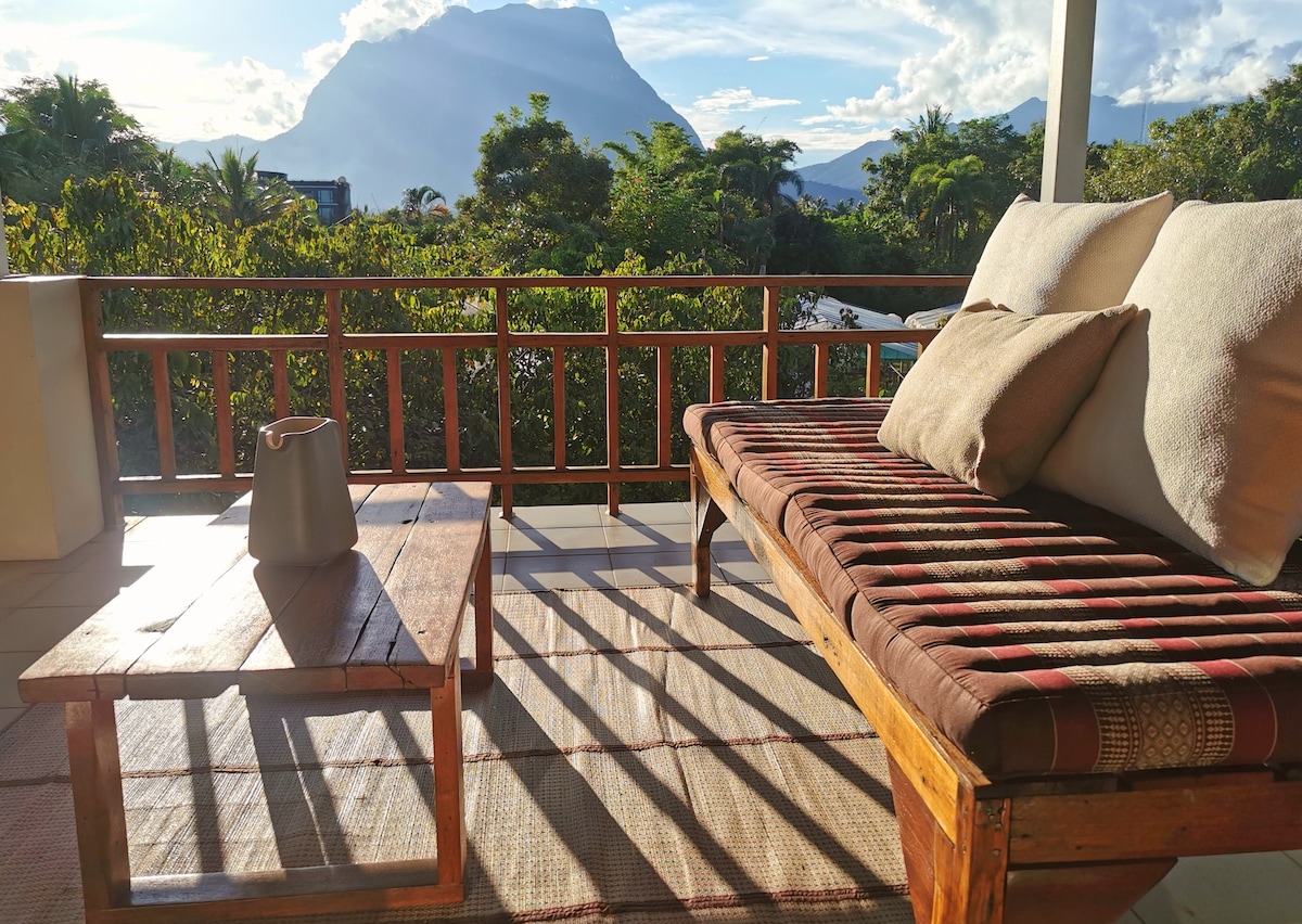 Casa rural entera con 1 dormitorio, 1 baño y balcón privado con vistas a la montaña. 1 de las 6 casas en el pueblo de Nitan. Cada casa es tranquila y tiene entrada privada. A solo 5 minutos a pie de la ciudad de Chiang Dao. Amplio terreno donde podrás relajarte y descansar en la naturaleza. Disfruta de las impresionantes vistas de la montaña Chiang Dao desde tu balcón, pero a pocos minutos a pie se encuentra el centro de esta pequeña ciudad donde puedes disfrutar de cafeterías, comida callejera y restaurantes locales.