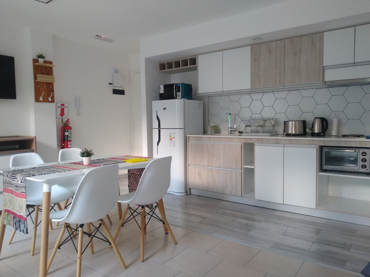 Hermoso gran departamento ideal para 4 personas. Decorado con estilo y equipado a estrenar. Localizado a 150 metros de la calle principal (San Martin). Ofrece todas las comodidades para una estadía ultra confortable y placentera. Posee una habitación en suite y otra con baño separado.