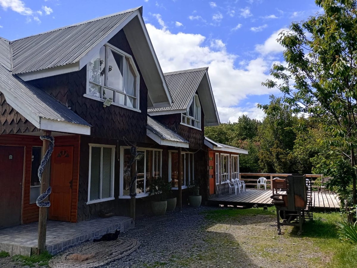 Casa equipada 5 personas... ubicada a 3 minutos del centro en vehículo, locomoción colectiva afuera de la casa. Es dpto interior con entrada independiente, estacionamiento, calefacción a pellet, wifi, roku, etc. En la casa principal (adelante) viven mis padres, quienes hacen entrega de las llaves de la cabaña y se encargan de todo lo que requiera el huésped. Se entrega una bolsa de Pellet cada 3 días de estadía. No cuenta con toallas ducha. Solo por temas de espacio, no se aceptan mascotas.