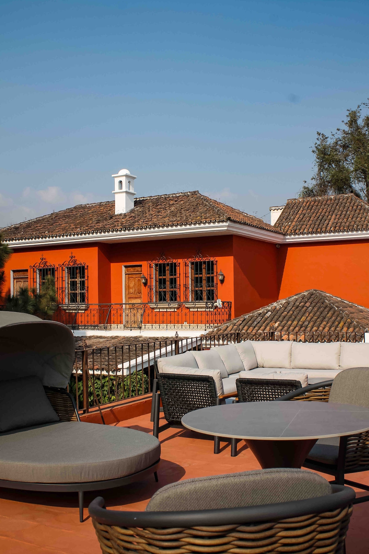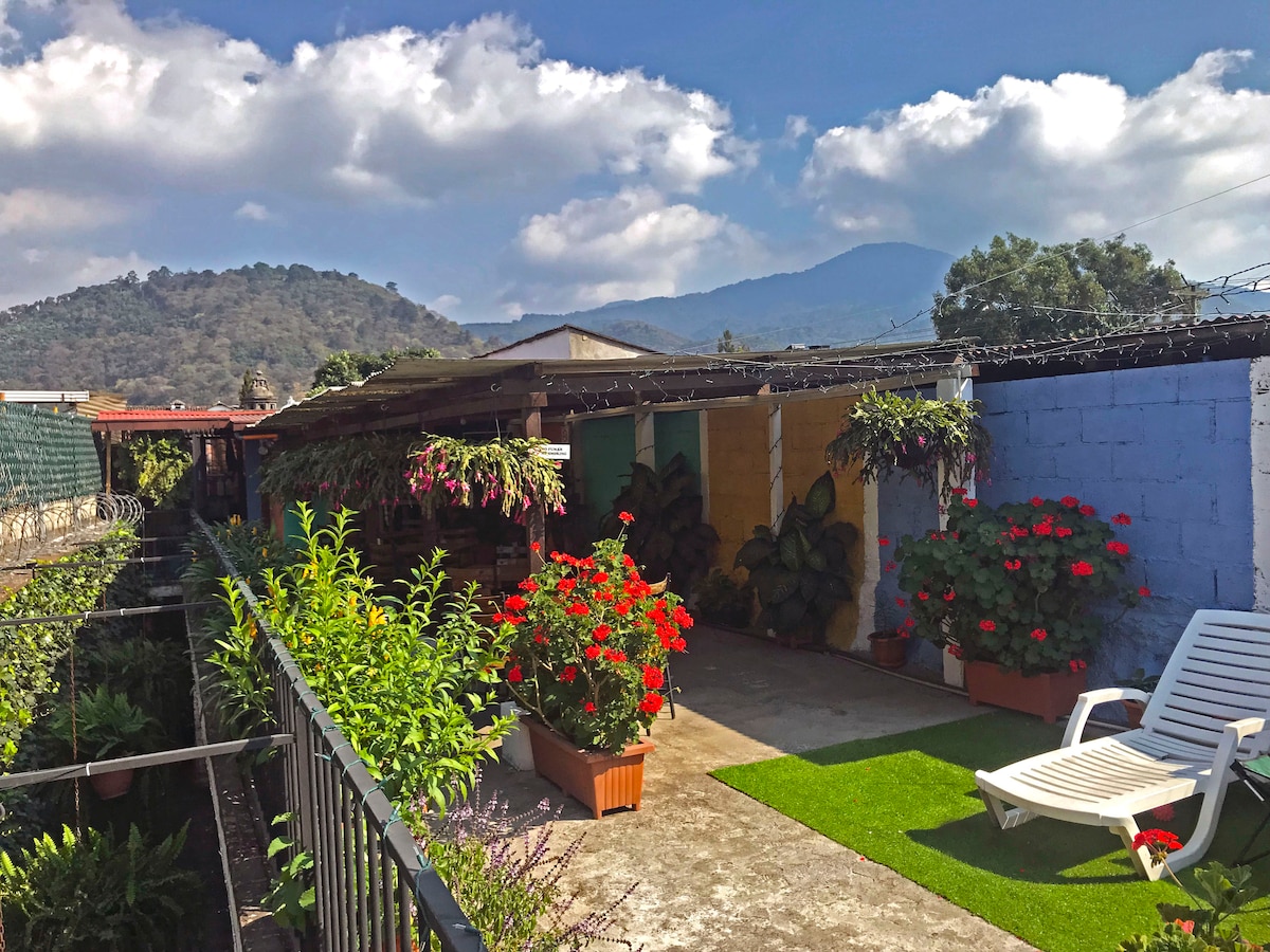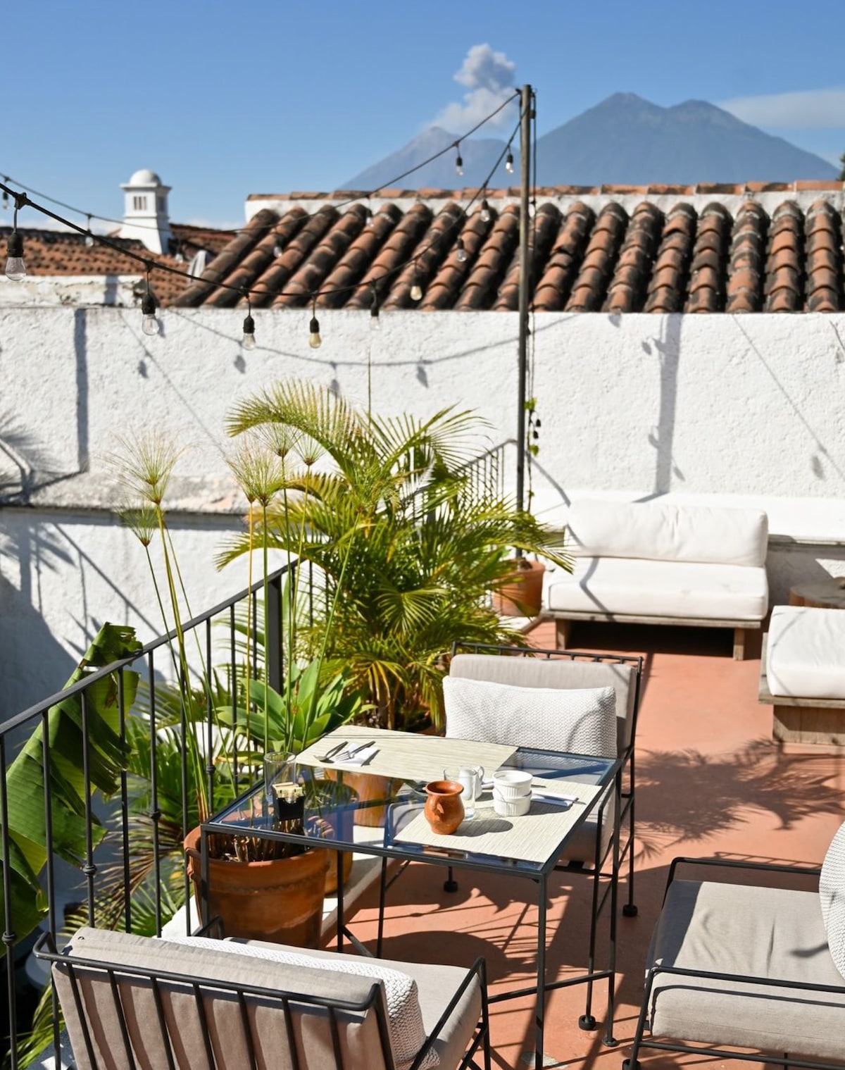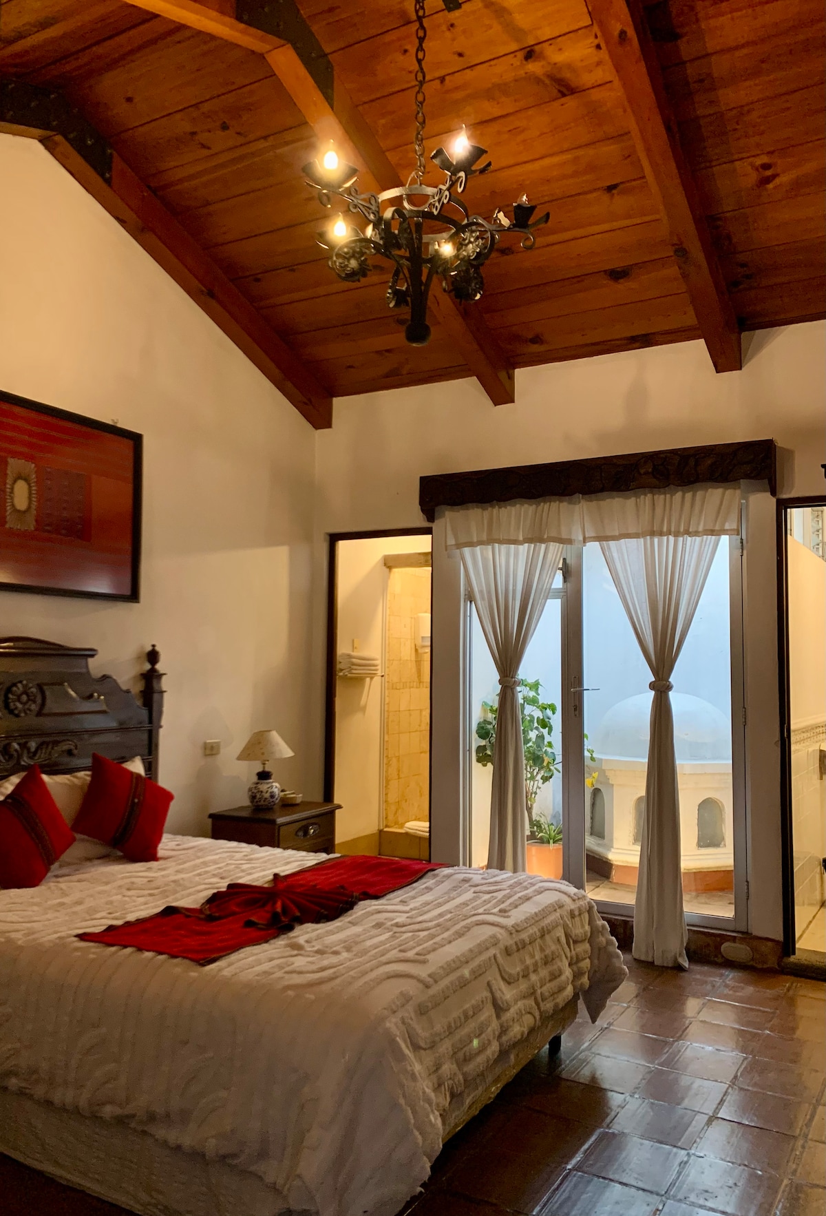 La suite Terrace: Una habitación grande y romántica ubicada en nuestro segundo piso, con acceso directo a nuestra terraza con vistas al jardín y a los volcanes Agua y Fuego. - Vista a la terraza. - Cama tamaño king con sábanas de algodón de calidad. - Baño privado con bañera y ducha. - SMART TV plana (32 pulgadas).