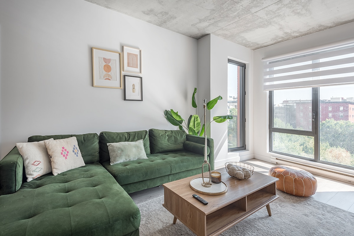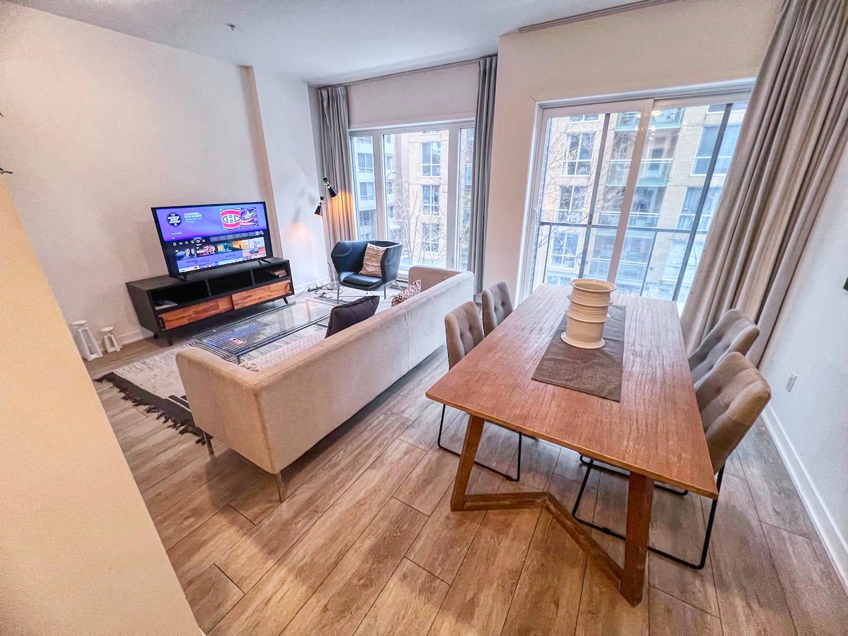 ¡Apartamento situado en pleno centro de la ciudad con acceso directo al Bell Center! Disfruta de tu estancia con lujo y comodidad en un apartamento de un dormitorio totalmente amueblado que incluye café, tostadora, hervidor de agua y todos los utensilios de cocina gratuitos. ¡Sauna, piscina, gimnasio con numerosas pesas y máquinas, salón panorámico, sala de juegos, salón y terraza con múltiples barbacoas a tu disposición! ¡Disfruta de un aparcamiento subterráneo gratuito y de un acceso a 1 minuto al sistema de metro sin tener que poner un pie fuera! Netflix incluido.