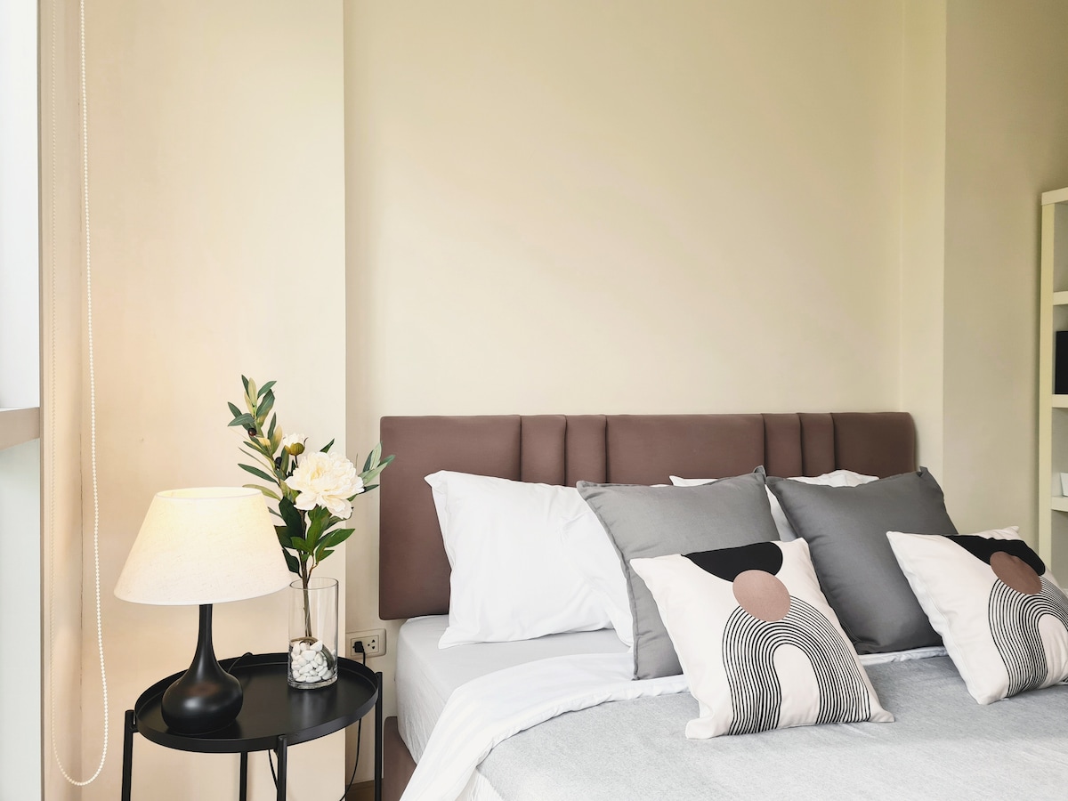 Relájate y desconecta en este alojamiento tranquilo y elegante al que puedes llegar directamente desde el aeropuerto de Suvarnabhumi y tener un fácil acceso al centro de la ciudad. - A 7 minutos a pie del tren elevado (estación de enlace del aeropuerto Ramkhamhaeng) que te conecta con cualquier lugar de Bangkok en BTS y MRT. - A 20-30 minutos en coche del aeropuerto de Suvarnabhumi. - Es fácil conseguir un autobús, taxi o bicitaxi. - Tienda 7/11 y una cafetería en el edificio, algo de comida callejera local cerca. - ¡Servicio de lavandería gratuito! (lavado, secado y doblado) - Servicios de seguridad las 24 horas y CCTV.