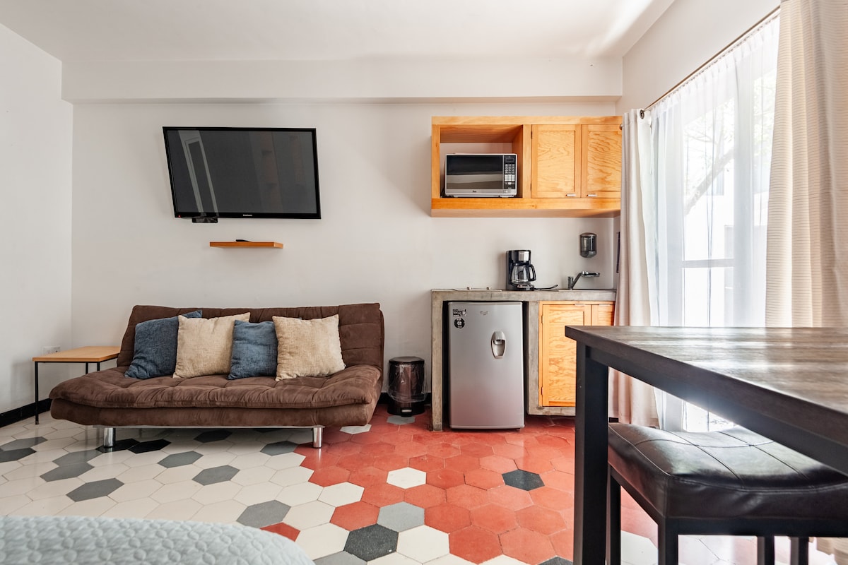 El Estudio, es un hogar que incluye una cama queen size, esta completamente equipado! Cuenta con un sofa cama, un comedor para 4 personas, ya sea que lo utilicen para trabajar o comer, cuenta con su televisión propia. Es el único loft que se encuentra junto a un pequeño jardín y sus banquitas para descansar, leer o simplemente disfrutar de la naturaleza (Area común) Es un lugar cómodo, que puedes aprovechar a hacer ejercicio o nadar, disfruta de una tarde de una espectacular terraza!!!