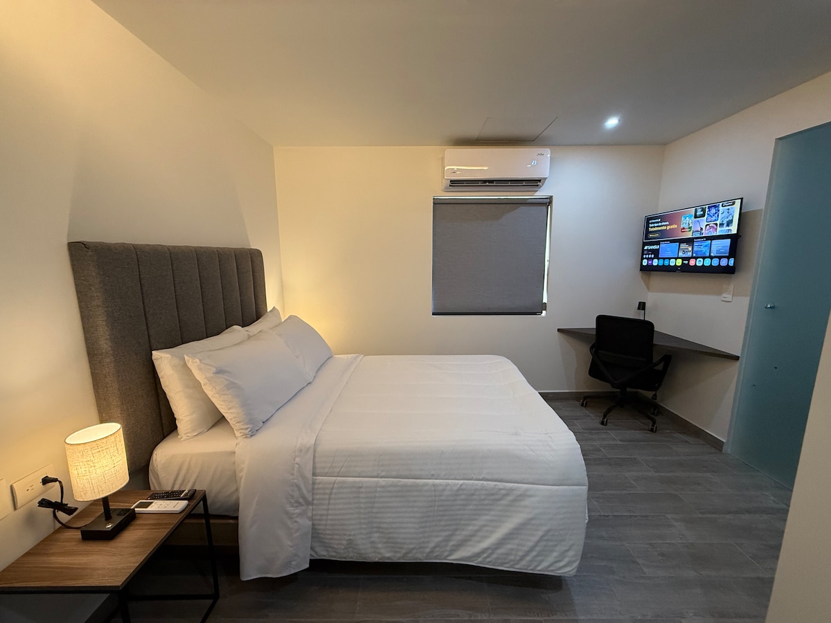 Disfruta de una experiencia única en nuestra acogedora suite, ubicada a solo unos pasos del histórico Barrio Antiguo y el vibrante centro de Monterrey. Está suite está cuidadosamente diseñada para brindarte el máximo confort. Perfecta para quienes buscan una estadía íntima en un ambiente relajante, rodeados de la cultura y energía de la ciudad.