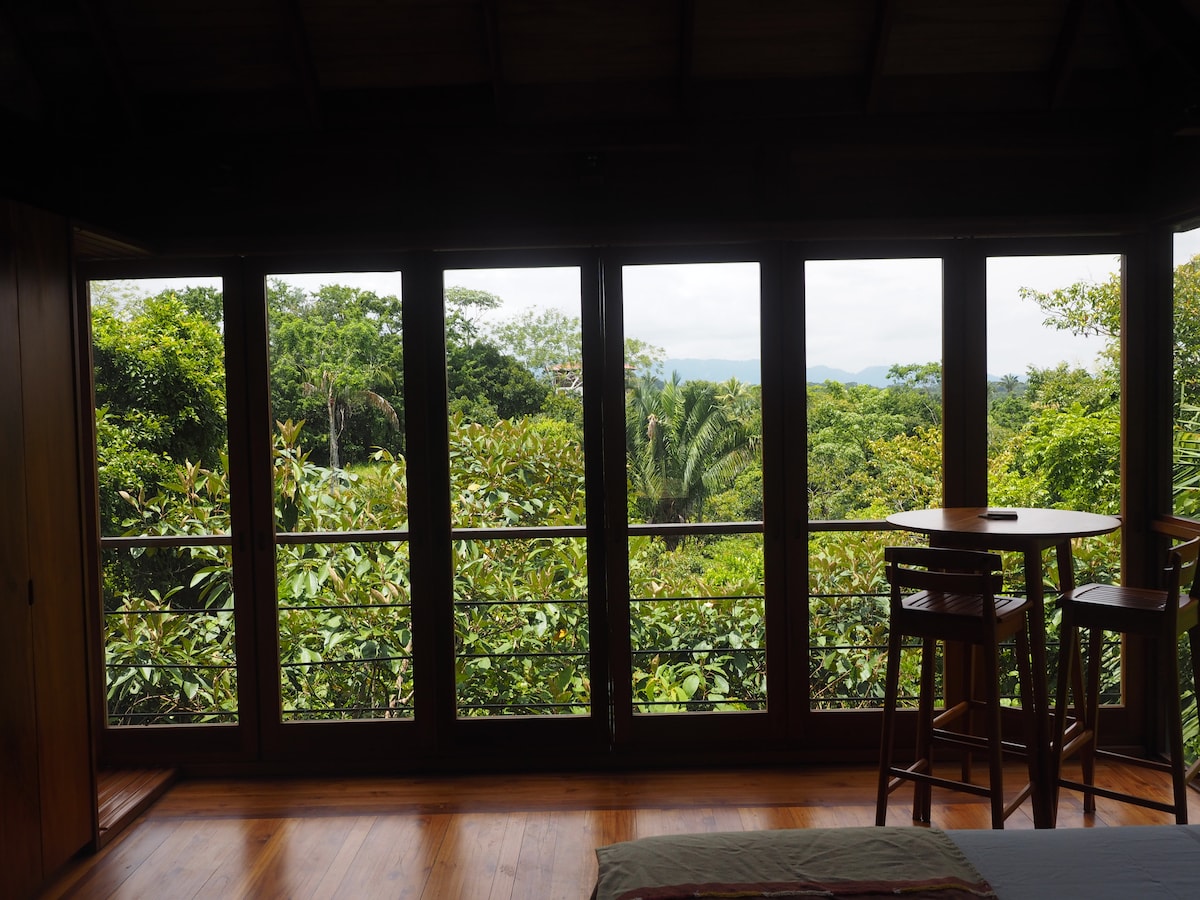 Encaramado en las copas de los árboles en el borde de un cañón, este bungalow único seguramente inspirará asombro a cualquier visitante al que se adapte. Con su diseño de estudio hecho a medida, este alojamiento es perfecto para una pareja que busca una escapada aventurera y romántica. Las paredes de vidrio deslizante y las ventanas panorámicas con mosquitero permiten una sensación de apertura si se desea. Una terraza privada, amueblada y cubierta proporciona un encantador lugar para sentarse y sumergirse en la naturaleza que la rodea.