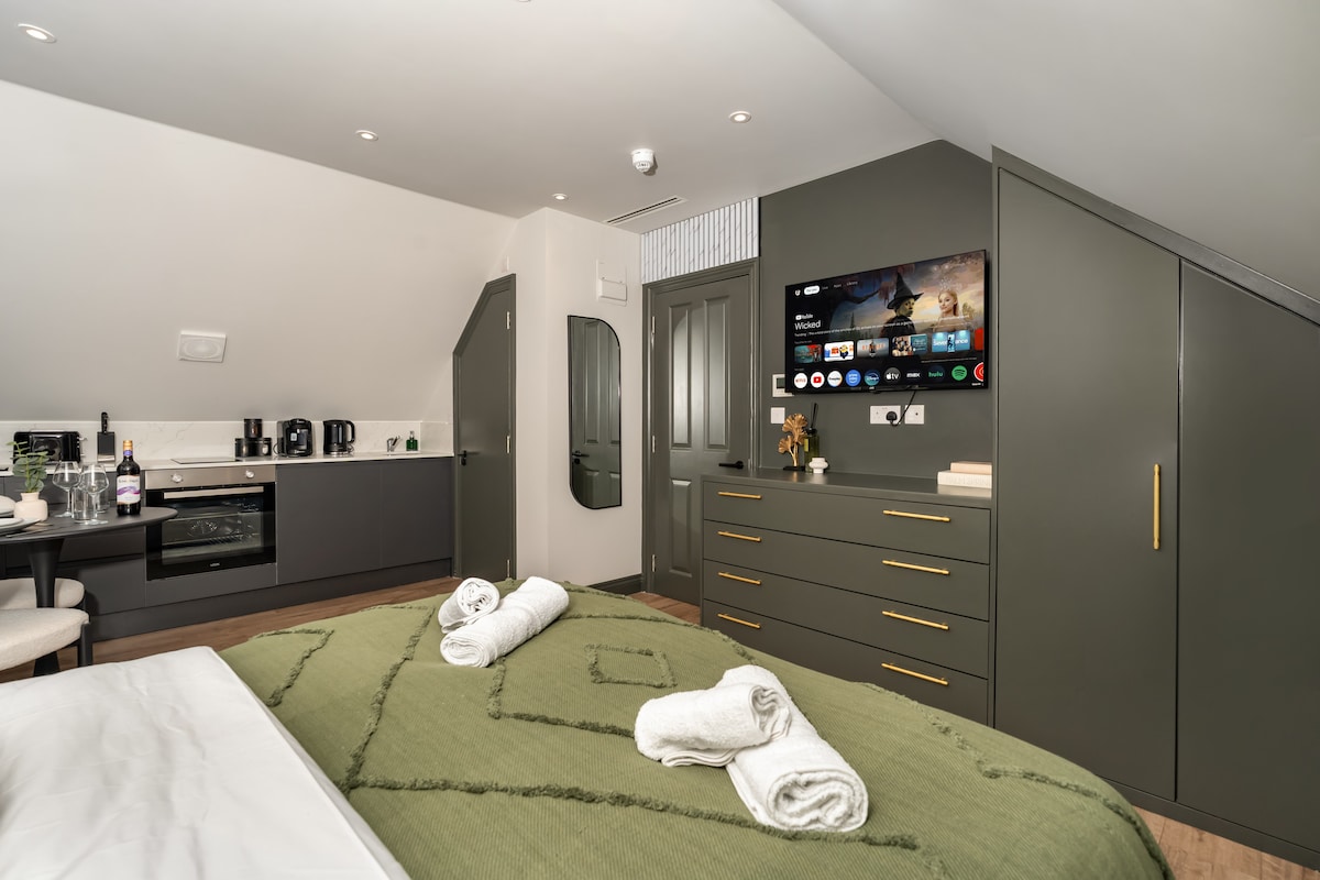 Con vistas a los campos, este lujoso espacio en el piso superior te invita a relajarte. Ultralimpio, tranquilo y muy bien diseñado. Equipado con todo lo necesario y mucho más. Prepara café fresco de grano a taza con la máquina de café Ninja Luxe. Transmite tus programas favoritos en los televisores inteligentes, juega juegos de mesa en grupo o trabaja donde la vista te inspire. Sea cual sea el propósito de tu estancia, trabajar o relajarte, ¡este es el lugar ideal! Londres está cerca, pero se siente como un mundo de distancia. ¡Siempre hay un lugar para estacionar también!