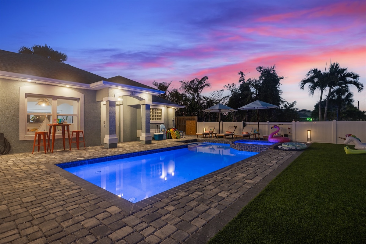 ¡Bienvenido a tu propio refugio privado! ¡Un paraíso! Situado justo enfrente de la famosa playa de Cocoa, en una calle muy tranquila. Esta casa actualizada está recién equipada con una hermosa piscina y un spa desbordante rodeado de un paisaje tropical. Todo, desde lujosas toallas de baño y sábanas hasta una parrilla Weber. Grandes televisores inteligentes en todas partes, incluido un gran segundo salón con puertas correderas que dan a la terraza de la piscina. A poca distancia a pie del muelle de Cocoa Beach y de restaurantes populares.