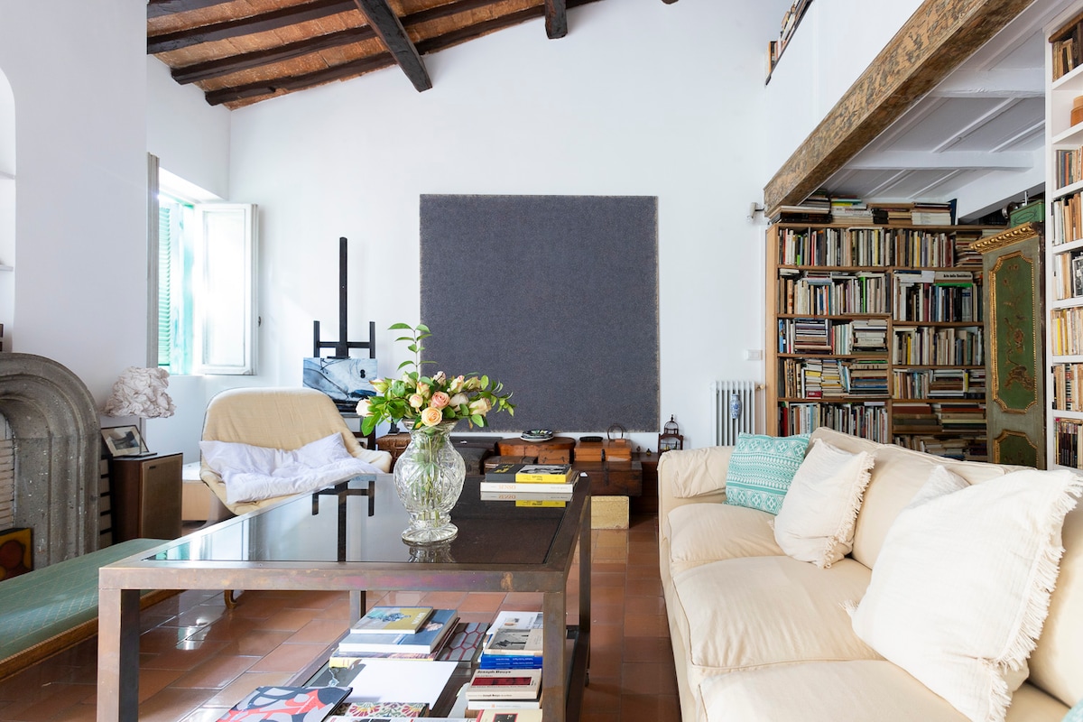 Un ático tranquilo (3er piso sobre el suelo) en el corazón de la zona peatonal y pintoresca de Trastevere. Una terraza íntima se encuentra en la parte superior. A pesar de estar en una de las zonas más animadas de la ciudad, este luminoso y espacioso piso se encuentra en una calle muy tranquila. Antigua casa de una gran artista del siglo pasado, el lugar ha sido recientemente renovado por completo, conservando su ambiente artístico original. Una acogedora azotea se encuentra en la parte superior de este apartamento de dos pisos. Ten en cuenta que NO HAY ASCENSOR. ¡Viaja ligero!