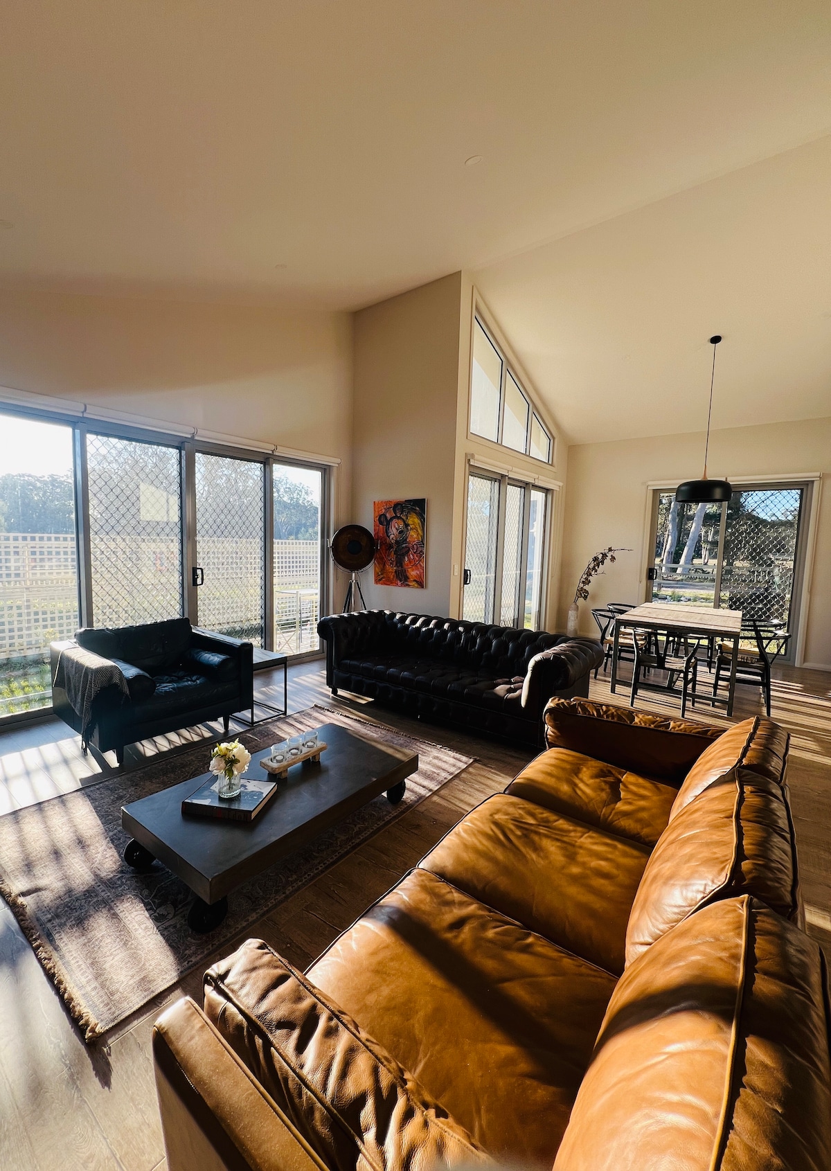 This is a comfortable self-contained studio, formerly an actual artist's studio, underneath the main residence, with its own shower and toilet, as well as a kitchenette. It has a queen bed, a king single that doubles as a sofa, and a single trundle bed. It has a small dining table and four chairs. It now boasts a camping washing machine for light loads, and an airer, as well as a dehumidifier. I also added an air fryer!