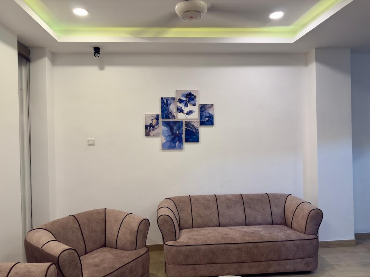 Lujosamente amueblado al nivel de la boutique con bragas empotradas. Con vistas al jardín ajardinado con borde de palmeras con piscinas, gimnasio, pista de calabaza, pista de barbacoa Con una ubicación céntrica cerca de Hilton Res. HSBC Supermercados Malls Restaurantes KFC Tarifa todo incluido. Sin cargos adicionales. Se ofrece recogida en el aeropuerto de cortesía (en coche) para estancias de más de 5 días (se requiere un número de teléfono móvil itinerante para la comunicación).