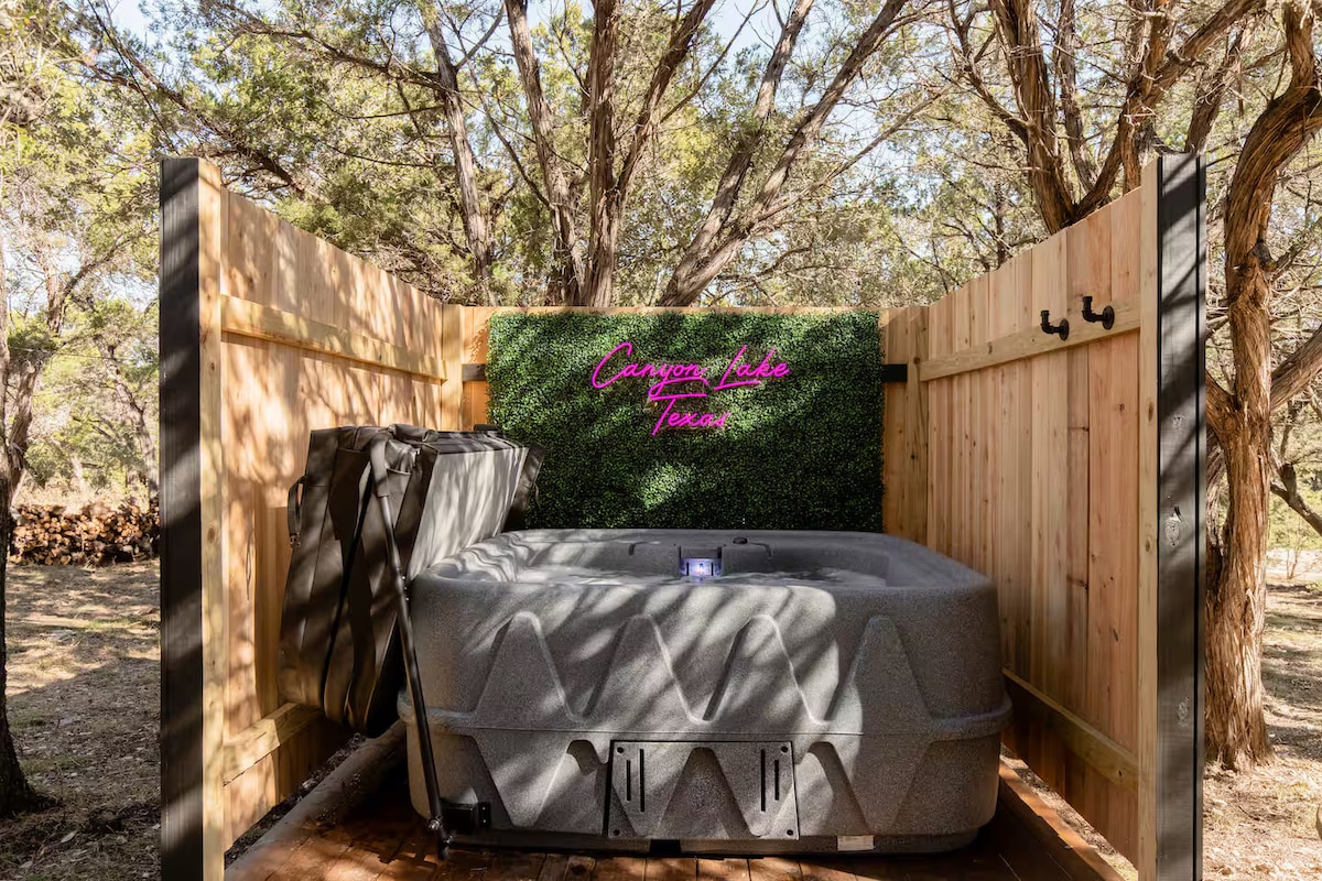 ***Ahora ofrecemos masajes para parejas**** A solo dos millas de Horseshoe en el río Guadalupe, esta acogedora cabaña de Canyon Lake se encuentra debajo de los árboles, ofreciendo privacidad y una excelente vista de la vida silvestre de Hill Country.En el interior, encontrará una cama king y una queen en dos cómodas habitaciones, cada una con su propio baño y ducha privados.La cocina completa hace que cocinar sea fácil y tendrás una mesa de comedor para cuatro, lavadora y secadora, televisor Roku de 65” e Internet de fibra para mantenerte conectado.