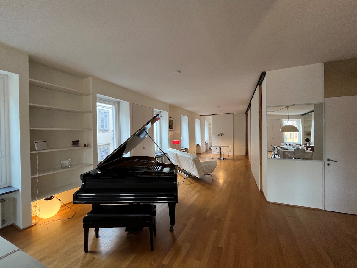 Loft exclusivo de 200 m² con 40 m² de terraza, en el centro histórico de Como, en una de las plazas más bellas de la ciudad. El ambiente es moderno y muy luminoso (19 ventanas), con paredes correderas de madera, un precioso suelo de roble y muebles de diseño italiano del siglo XX, con algunas piezas icónicas, y un piano de cola Bechstein. Vivirás una experiencia electrizante y alegre en un ambiente ecléctico y elegante, para una estancia marcada por el espacio y la libertad.