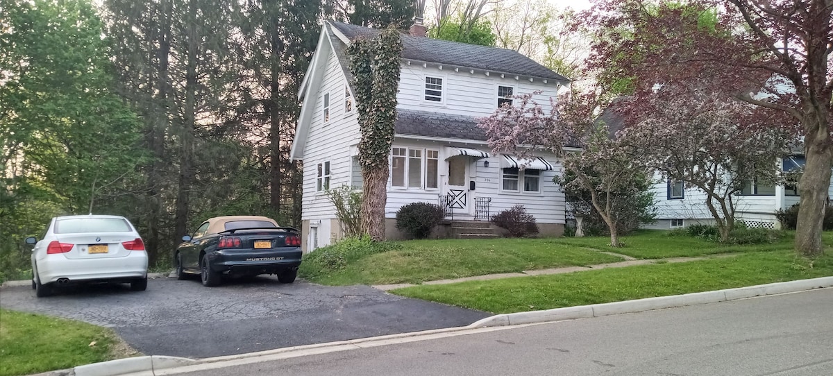 Casa de 2 dormitorios en un barrio tranquilo. A solo un minuto de la salida 12 de la I86, el registro automático de Keybox llega tan tarde como sea necesario. Las camas y el baño están en el segundo piso, y es una casa antigua, las escaleras son empinadas. La cocina, el comedor y la sala de estar están en el primero. Porche delantero cerrado ideal para el café de la mañana, el sótano tiene lavandería, un futón flop y almacenamiento seguro para bicicletas. El patio tiene vistas al santuario de aves RTPI y tiene una zona de estar al aire libre con fogata. Estacionamiento en la entrada. Anfitrión en el vecindario.