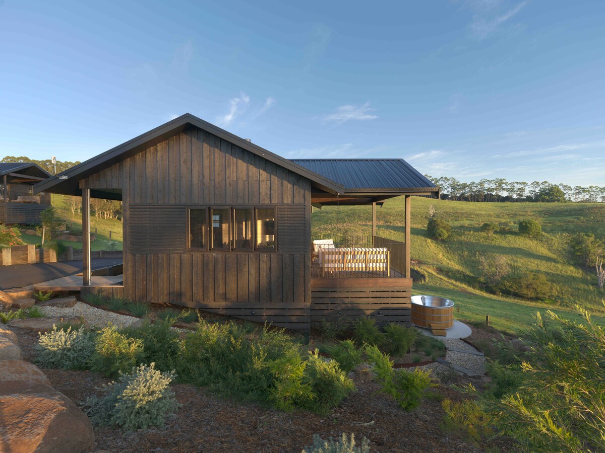 Las cabañas de lujo Black Cockatoo Coorabell son espacios bellamente diseñados y hechos a medida que te ofrecen paz y tranquilidad con impresionantes vistas al interior de Platypus Dam en 120 acres de tierras de cultivo de primera calidad. Las cabañas están lujosamente decoradas en todas partes utilizando muchos materiales crudos y naturales, cerámica, muebles y muebles hechos a mano localmente y su propia bañera de hidromasaje para relajarse y relajarse.