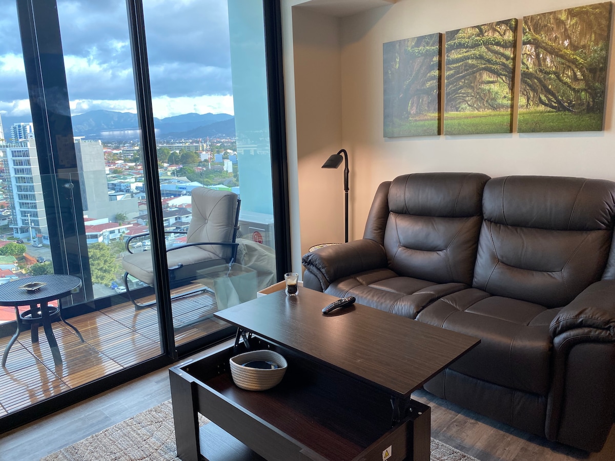 ¡Este es el estilo de vida que te mereces! ¡Calificado en el 5 % de los mejores por los huéspedes! Diseñado para estadías largas, trabajo remoto, turismo médico, base de excursiones de un día y nómadas digitales. Cómodo, lujoso, respetuoso con el medio ambiente, apartamento totalmente equipado en el piso 14 de la Torre Cosmopolita, el edificio más nuevo en la mejor ubicación de San José . Está ubicado cerca de los aeropuertos, hospitales, embajadas, parques para correr, sinagoga, restaurantes y comida rápida, tiendas de conveniencia, centros comerciales. ¡Disfruta de las vistas nocturnas de las luces de la ciudad todos los días!