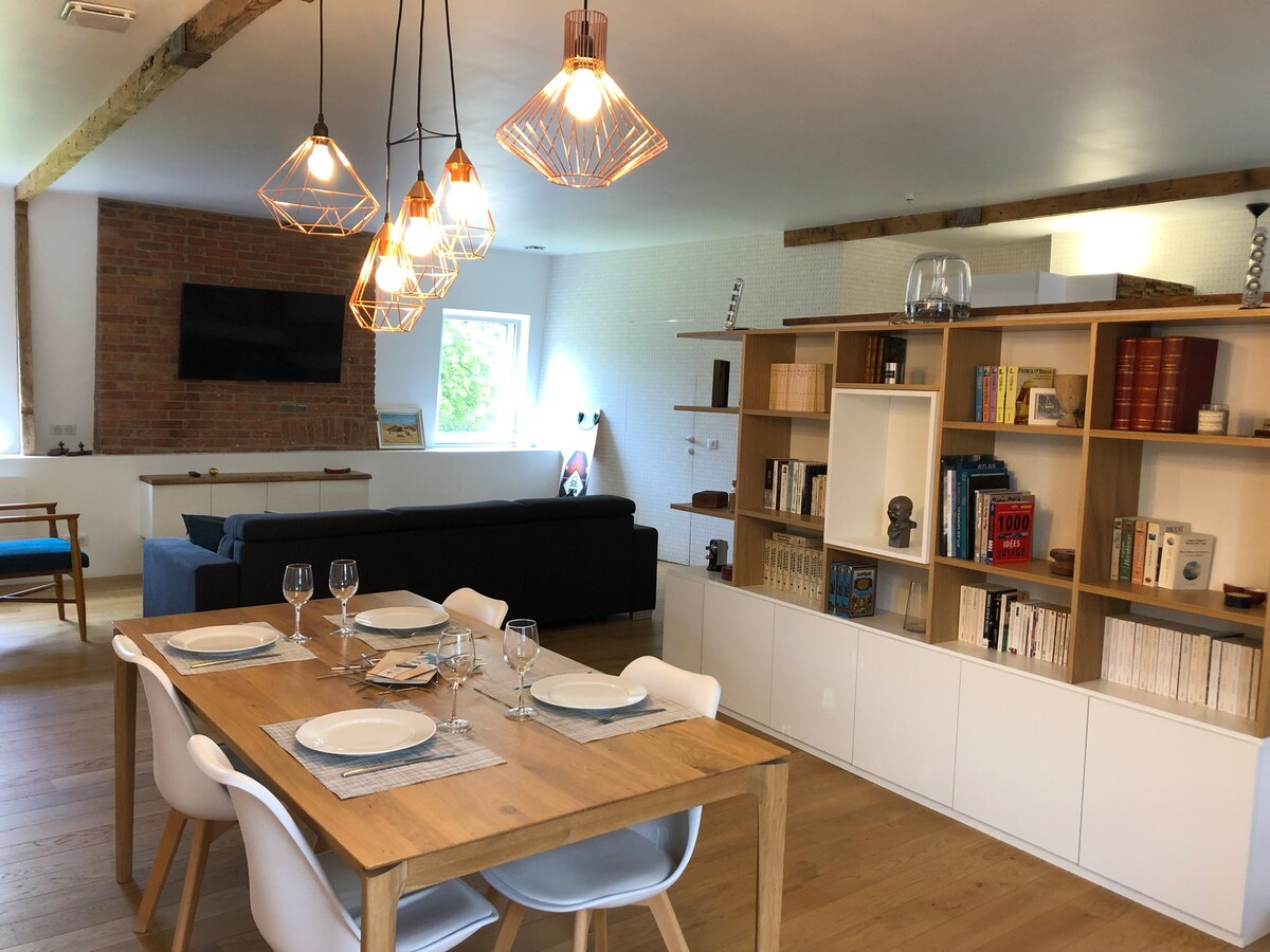 ⚠️ No está permitido reservar para otra persona, las reservas son nominativas. Disfrute de una estadía en este estudio loft situado en la planta superior con vistas al canal de Nantes en Brest. Este alojamiento le ofrece un baño turco privado en la ducha, una bañera de hidromasaje para dos personas, una cocina totalmente equipada (horno, placas, microondas, cafetera) y un televisor conectado con barra de sonido. Su espíritu loft con buena altura del techo crea un ambiente cálido y moderno.