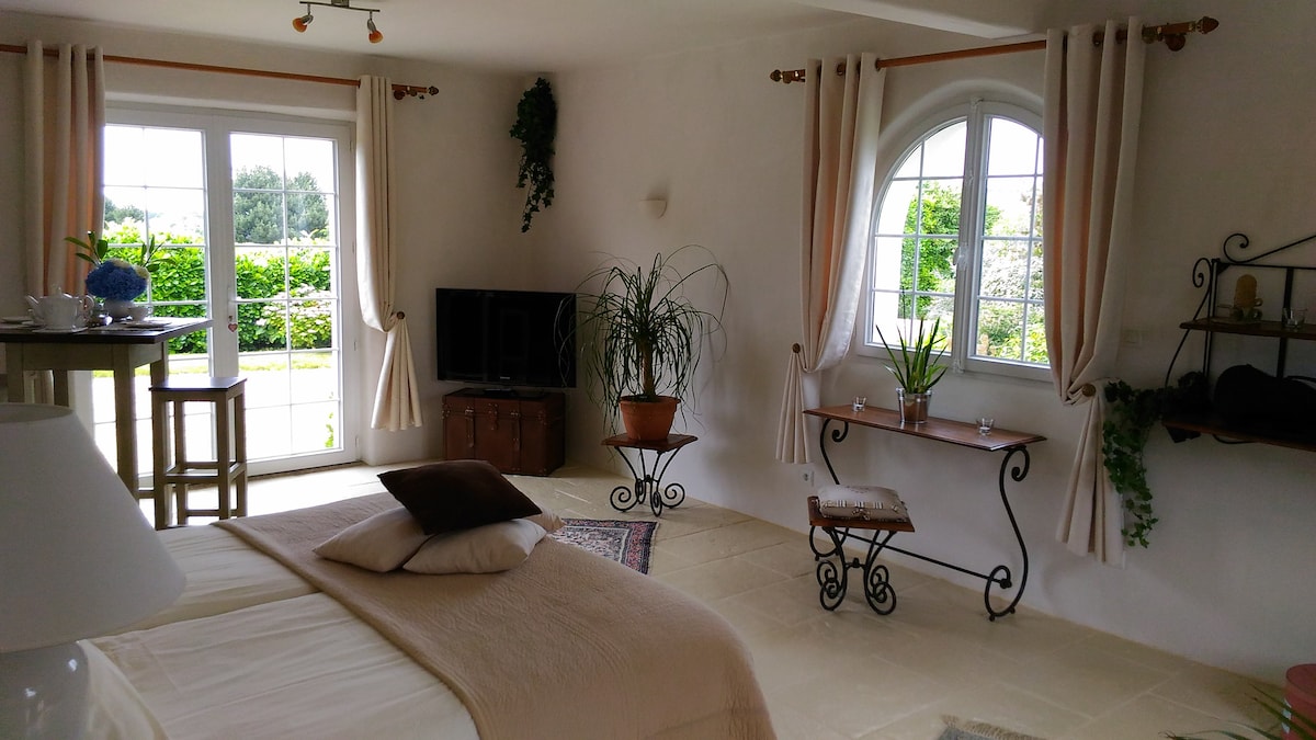 Le damos la bienvenida en un entorno excepcional cerca de la playa (a 10 minutos a pie por un sendero arbolado) y junto al campo de golf de Pen- Guen. Un establo situado a 10 minutos en bicicleta le dará la bienvenida con mucho gusto para paseos a la altura de su estancia. 1 habitación de 45 m² espaciosa y luminosa.