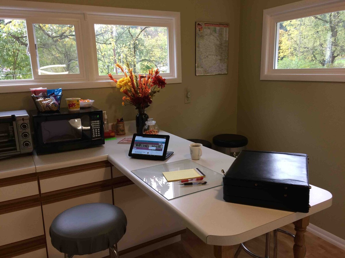 Después de un divertido día en The Driftless Area, ven a relajarte y relajarte en Prairie du Chien. Hermosa casa decorada de 2 dormitorios con una amplia cocina, isla grande, lavavajillas, lavadora/secadora y ducha a ras de suelo de 5'. Suministramos todos los artículos/utensilios de cocina/hornear. Internet de alta velocidad con televisores inteligentes en ambos dormitorios y sala de estar. Piscina al aire libre (de temporada), bañera de hidromasaje y silla de masaje. También nos encantan los perros, por lo que ofrecemos una carrera para perros (se aplica una tarifa por mascota). Para nuestros pescadores, hay estacionamiento fuera de la calle para sus barcos.