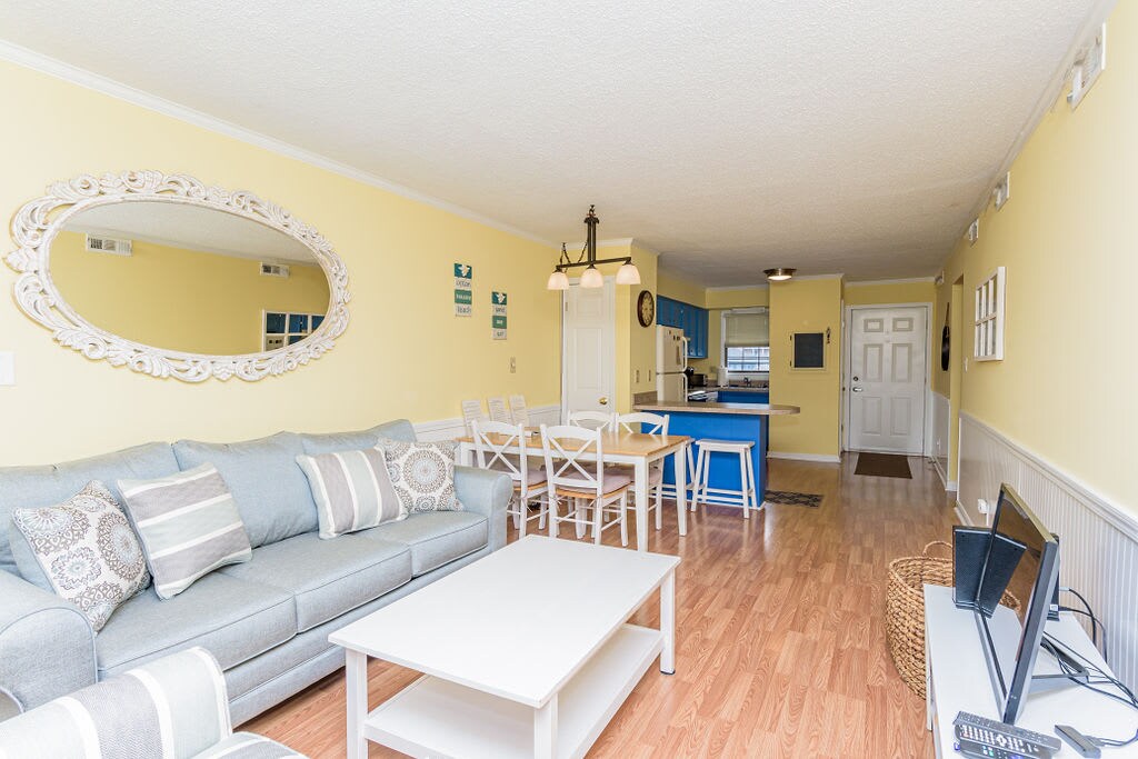 1 Bedroom/1 Bathroom Ground Floor Condo w/ Pool, ideally located just a minute's walk to the Beach & Boardwalk. Updated in 2025! Bedroom offers a king bed w/ Medicoil Luxury Mattress, blackout curtains, a dedicated AC unit, & a 70" UHD Flatscreen TV. Bathroom features modern coastal finishes, a new comfort height toilet, & a 30" vanity. Full, well-appointed kitchen w/ new convection oven/range. All new furnishings and 70" UHD Flatscreen TV in living area. Front covered porch w/outdoor furniture.