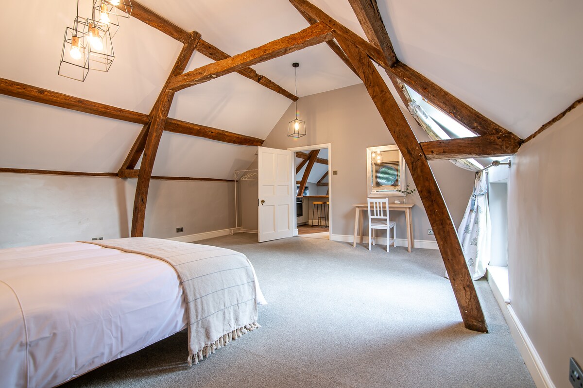 Una habitación anexa relajante y espaciosa situada en una zona rural con vistas a campos abiertos hacia las colinas de Malvern. Ubicada en una zona tranquila, esta habitación anexa ofrece la sensación de estar en el campo y, al mismo tiempo, tiene un excelente acceso a la red de autopistas, lo que nos convierte en una opción perfecta tanto para viajeros de negocios como de placer. Una habitación doble con zona de sofá adyacente (cama individual extraíble también disponible bajo petición), TV y ducha en suite. También aceptamos perros que se porten bien con acuerdo previo.