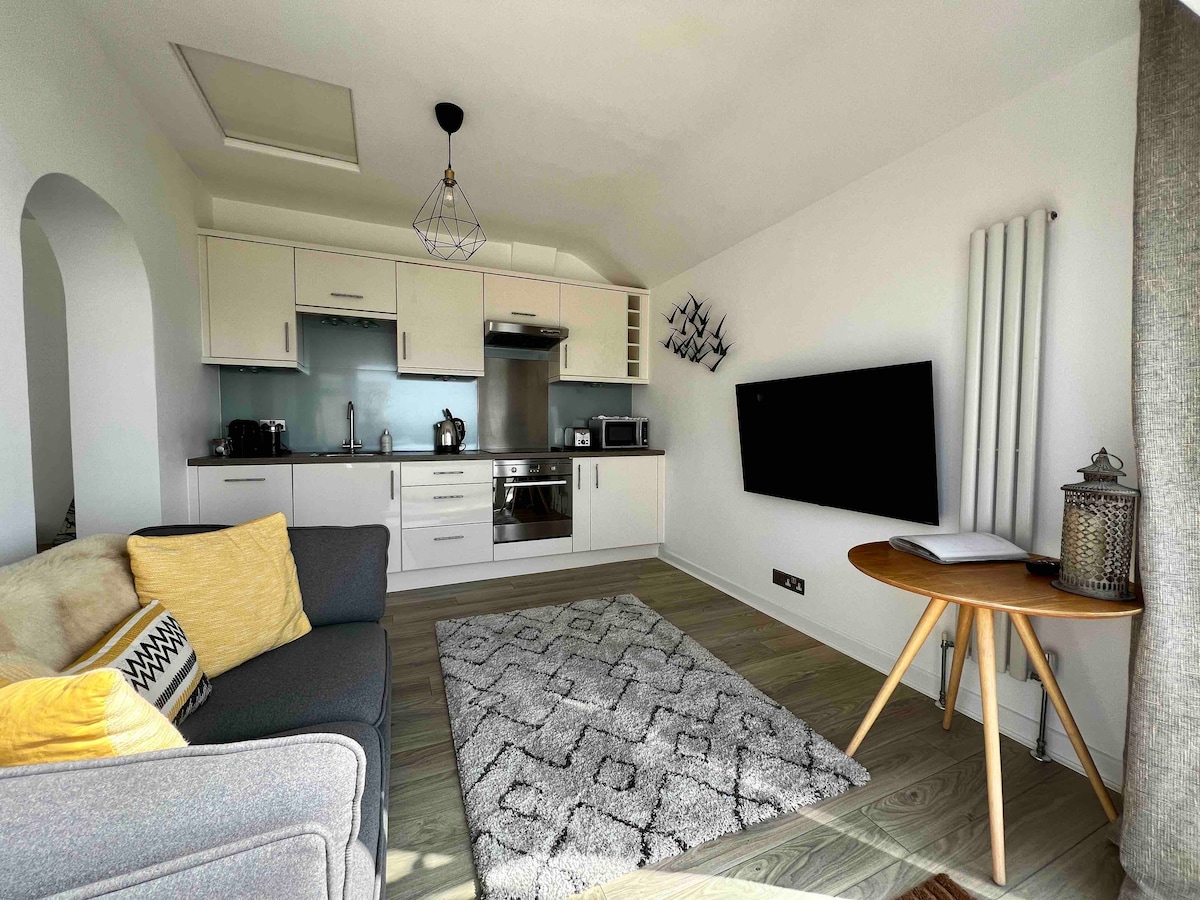 Board Room @ Green Rooms es un apartamento contemporáneo y espacioso de un dormitorio. Las puertas plegables de 5 metros de la sala de estar se abren a tu propio jardín privado con cubierta y orientado al sur. Un verdadero solarium con tumbonas y zona de comedor al aire libre para disfrutar. Te espera una gran noche de sueño en la suntuosa cama tamaño king y por la mañana abre la enorme puerta corredera del granero para revelar la vista del sol saliendo sobre Saunton Down justo desde tu cama.