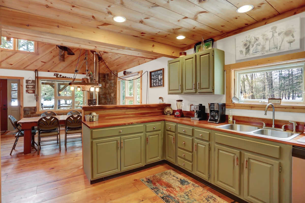 - Propiedad arbolada tranquila con cabaña de madera. - Zona de jacuzzi y fogata. -Entorno tranquilo, respaldado por tierras de caza estatales. - Chimenea en la sala de estar, wifi, Roku TV, mesa de ping pong. - Garaje para dos coches. Explicación de la cama/baño: 6 camas en total: 2 camas tamaño queen, 2 camas dobles en el loft con vistas al comedor y 1 sofá cama en el sótano de la cabaña principal. 1 cama tamaño queen en la casa de campo privada.