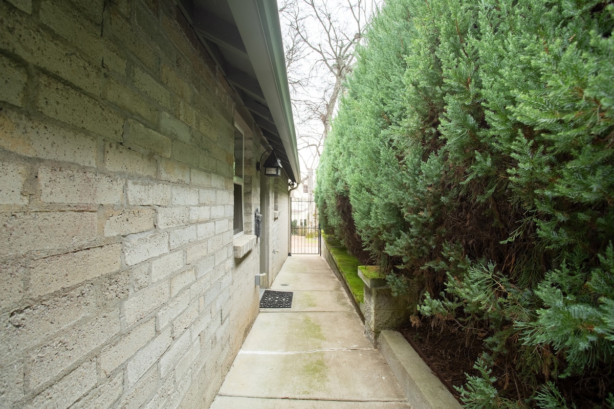Este espacio es completamente privado y está separado de la residencia principal. Cuenta con una cama tamaño king, baño con ducha, cocina completa y sala de estar con pantalla plana y cable. Los techos abovedados con gruesas vigas de madera dan al apartamento una sensación de amplitud. El suelo está hecho con baldosas mexicanas de terracota; la decoración es brillante y funky. Las puertas francesas se abren a un patio privado conectado al aparcamiento cubierto. Se encuentra en el histórico Inglewood/East Nashville. El tranquilo barrio está cubierto de árboles maduros y está a solo una manzana del río Cumberland. Parece que estás lejos de la gran ciudad, pero en realidad estás a pocos minutos de Opry Mills y del centro de Nashville. A pocas manzanas encontrarás restaurantes de moda, cafeterías, pubs y transporte público. **Somos grandes amantes de los niños y los animales, pero nuestro espacio no es seguro para los niños. Tenemos una política de no niños menores de 12 años y una política de no mascotas. Sentimos los inconvenientes que esto te pueda causar.