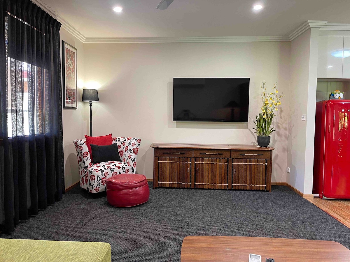 Riverside Park está junto a un hermoso parque en la parte trasera de la residencia principal con entrada privada y segura. Ideal para una pareja o una persona soltera que busca una escapada o un profesional que visita Mildura por negocios. Estamos a 5 minutos a pie del maravilloso río Murray con cafeterías y restaurantes. A 10 minutos a pie del centro de la ciudad y del centro de arte, boutiques, restaurantes, cafeterías, bancos y supermercados. Aire acondicionado de ciclo inverso. Desayuno ligero también incluido. Puertos USB disponibles.