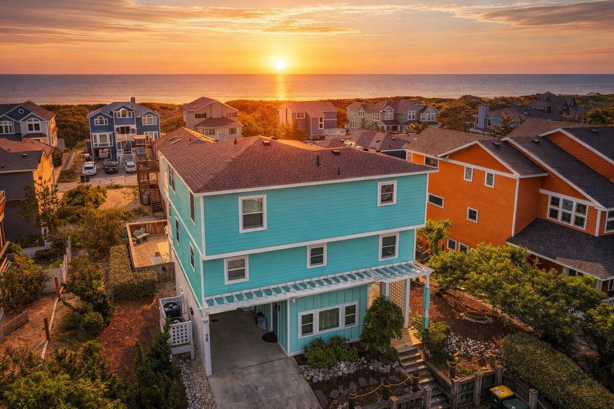 ¡Sunrise Surf House está justo enfrente del océano, con excelentes vistas! El acceso al mar está a solo 2 casas de distancia. Nuestra gran piscina tendrá calefacción gratuita a partir de finales de abril y octubre. También tenemos una bañera de hidromasaje para 6 personas en la terraza de la piscina, cerrada en enero/febrero. ¡Se admiten familias y perros! (Consulta las Reglas de la casa). Estamos ubicados en el centro, a 3 casas del centro comercial Southern Shores Crossing, donde puedes caminar hasta cenas, pizza, helados, tiendas e incluso una sala de escape.
