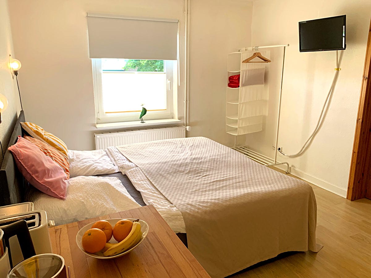 Estudio de 1 habitación (aprox. 22 m²) Camas con somier Mesa + 2 sillas Minicocina (nevera, cafetera de filtro, tostadora, hervidor de agua, vajilla) Baño (inodoro/ducha) TV + WiFi (cable de fibra óptica) Al dique: 15 minutos a pie y 8 minutos en bicicleta. A la playa: 25 minutos a pie y 12 minutos en bicicleta. Acceso al jardín y sala común (mesas y sillas, sofá y sillón, juegos, libros, material informativo, lavavajillas, nevera-congelador) Impuesto turístico en el sitio (tarifas en el sitio web de Friedrichskoog) Limpieza final: 20 €