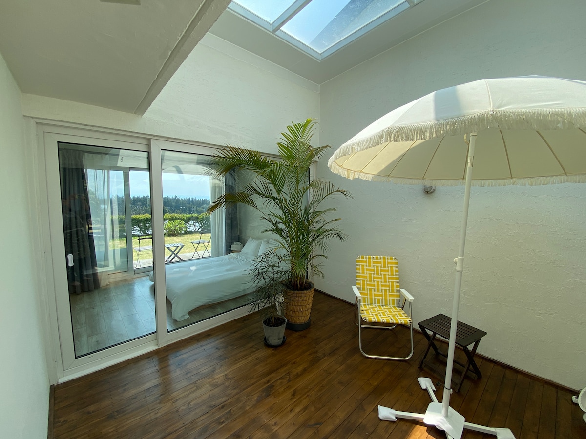 • Máximo 2 personas, incluidos adultos y niños (bebés y niños pequeños). • Pensión tranquila con un diseño de un famoso arquitecto y una decoración blanca • Vista panorámica del mar lejano y del cedro (la vista del jardín puede ser diferente a la de la foto). • Cama queen size (ropa de cama adicional es un servicio de pago) • La ubicación de la sala de estar y el dormitorio cambia durante el invierno. • Cocina (no se permite asar) y comedor en la habitación con posibilidad de cocinar sencillo • Jardín privado, ducha y baño • Inducción, caldera eléctrica (sin instalación de gas) • Desayuno: el café ofrece un desayuno sencillo (tostadas y zumos) • No se permite hacer barbacoas. • Transporte: 10 minutos en coche a Jungmun, 15 minutos a Seogwipo, 30 minutos a Hallasan Yeongsil Coast, 50 minutos al aeropuerto, 4 minutos a pie desde la parada del autobús del aeropuerto