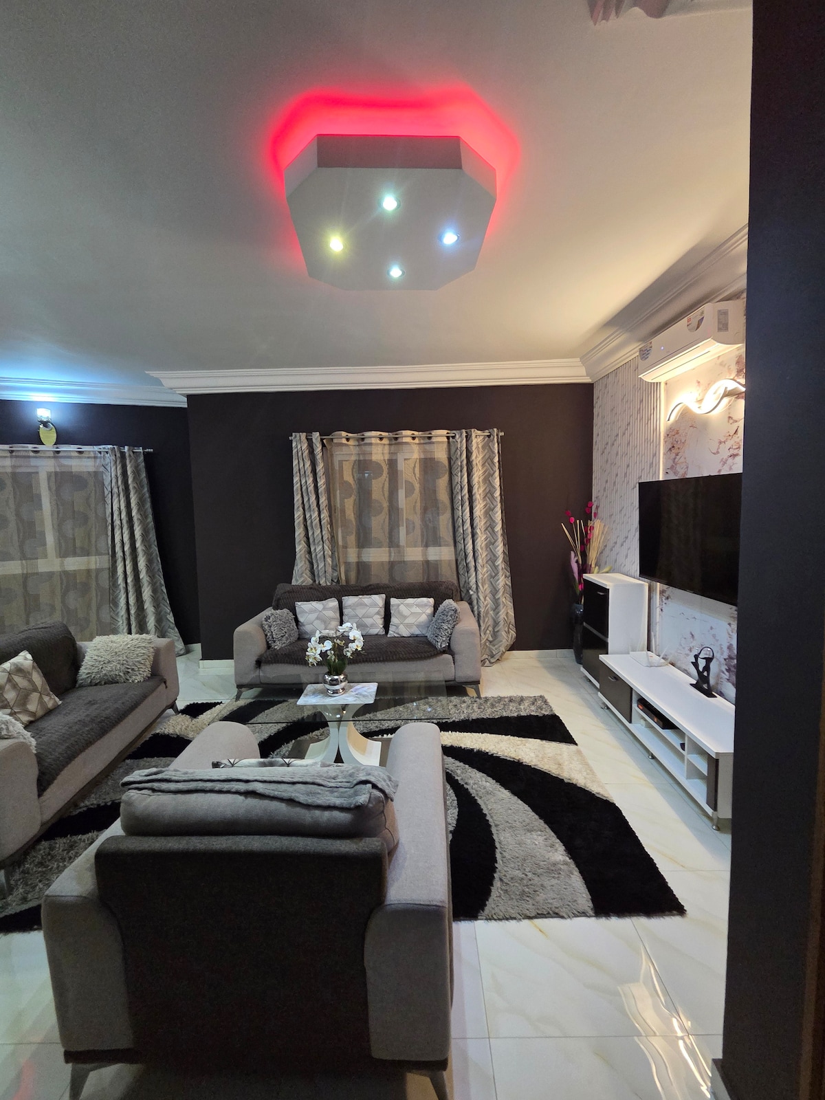 Amplio y cómodo 3 dormitorios bellamente diseñados con aire acondicionado en los dormitorios y la sala de estar. Agua caliente en los baños A las familias con niños les encantará el lugar. Las sábanas y toallas limpias vienen selladas por la empresa de limpieza. Wifi, ambiente tranquilo. Cocina totalmente equipada, ya sea que te guste cocinar o simplemente necesites una comida rápida, la cocina moderna tiene todo lo que necesitas. Aparcamiento privado, generador para energía ininterrumpida, lavadora. Check-in sin restricción de horario con el código proporcionado.