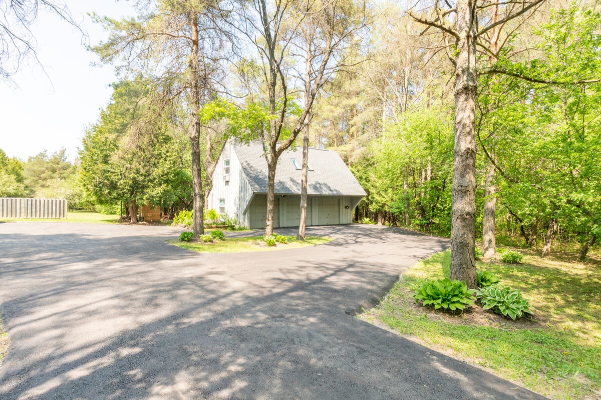 Kick back and relax in this calm, stylish space. Cozy 1 bedroom carriage house loft (appx 650 sq ft) above detached 3 bay garage in serene country setting on 5 acres of pine and cedar with a river running thru it. Pullout couch can accommodate 2 additional people. Walk across the road to Pollinator Garden & Island Lake Trails. 6 min drive to Hockley Valley Resort and Adamo Estate Winery, as well as beautiful downtown Orangeville boasting fabulous restaurants and quaint shops.