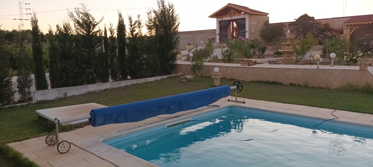 Ce logement paisible offre un séjour détente pour toute la famille. Pour vos séjours en famille ou en amis une Très belle villa de charme entièrement privatisable (meublée et bien équipée) avec jardin de bon décoration équipé d'une piscine avec jaccussi. La villa est équipé d'un gardien . Vue dégagée 360° nature Grand salon et 3 chambres à coucher. Parking pour voitures. Salle de bain . ... située à #Somma. #Nabeul dans une région sécurisée .