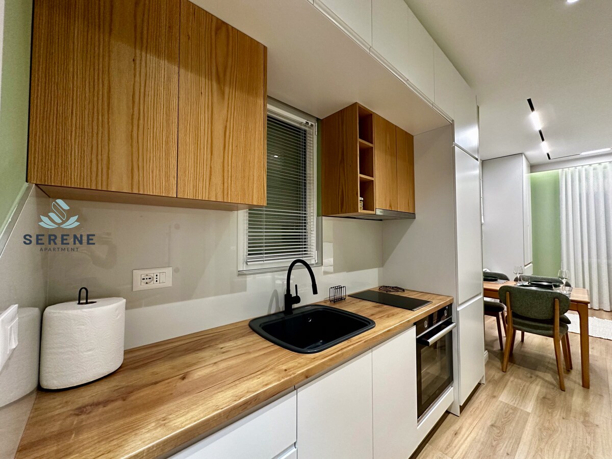 Apartamento Serenade – Alojamiento de élite en el centro de Korça (Serenity Residence, 2022). Situado enfrente de la Catedral y a solo unos pasos de la zona peatonal. * Espacio: para 5 huéspedes, 2 dormitorios, 2 baños, cocina totalmente equipada. * Climatización: calefacción por suelo radiante en toda la casa (sistema Nibe) y refrigeración por ventiloconvector en la sala de estar. * Seguridad: edificio vigilado por cámaras las 24 horas, los 7 días de la semana. * Estacionamiento: plaza privada en el nivel -2. ¡Moderno, seguro y perfectamente ubicado para tu estadía!