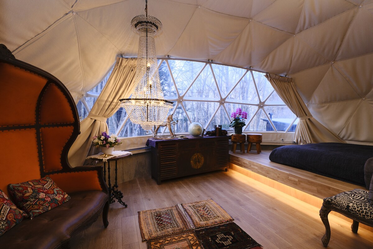 Despiértate a unos pasos del lago Tōya en una elegante tienda de campaña glamping con capacidad para 4 personas, con tu propia terraza, parrilla y vistas serenas a la naturaleza. Disfruta de un espacio privado, una iluminación acogedora y un fácil acceso a piragüismo, SUP y mucho más. Cocina totalmente equipada, chimenea y ventiladores alquilables, y juegos de barbacoa de pedido anticipado que lo hacen sin complicaciones. Toques pensativos, anfitriones amables y atardeceres mágicos completan la experiencia. Perfecto para parejas, familias o amigos. ¡Reserva ahora para una estadía que no olvidarás!