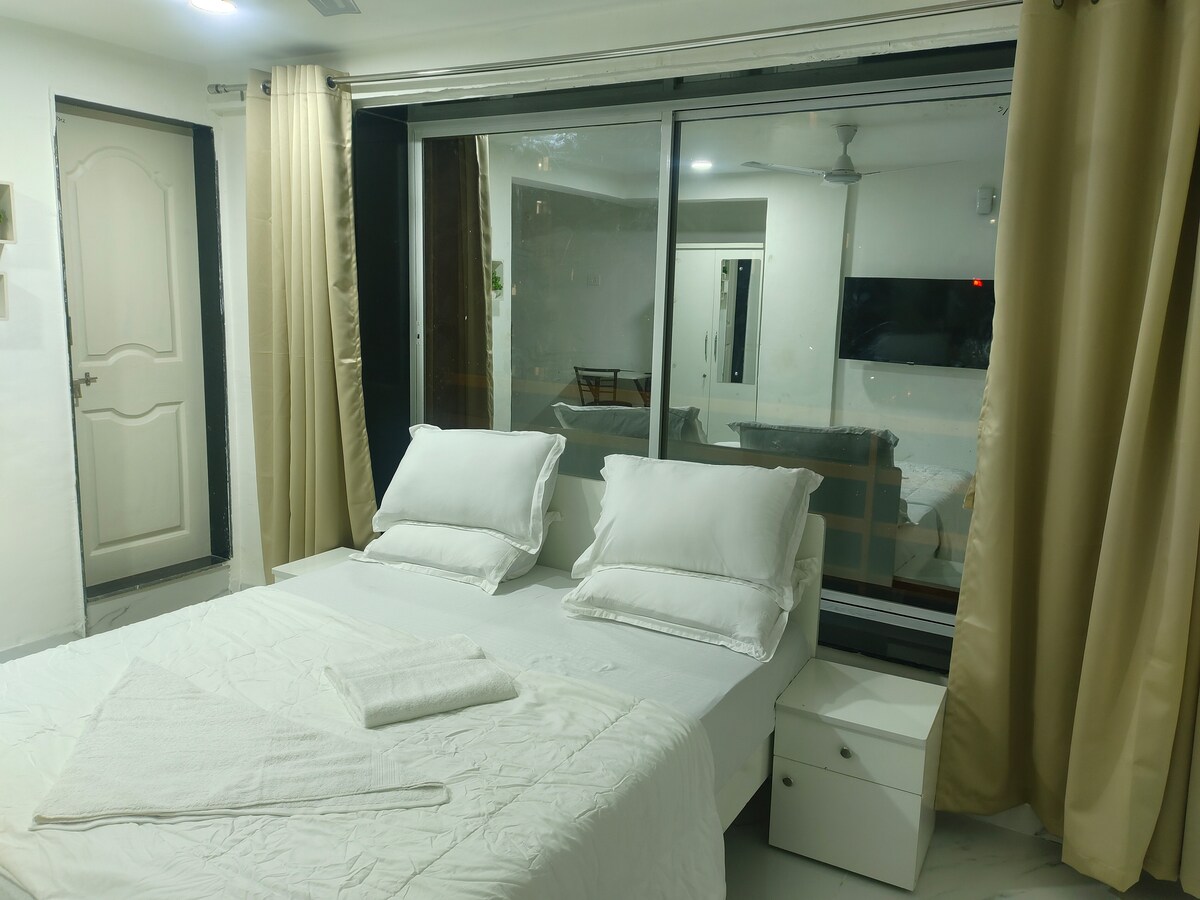 Unwind and enjoy your time in this serene and chic environment. A well-linked accommodation option. Amenities: Air conditioned Fully automatic washing machine High-speed WiFi 8-hour power backup Fully equipped kitchen Refrigerator Dining table RO water Reserved Car parking Serviced by Ola , Uber Swiggy, Zomato etc * complementary house keeping / cleaning twice a week *homemade food is available at extra charges *Entire flat is available to guest without sharing *couple friendly