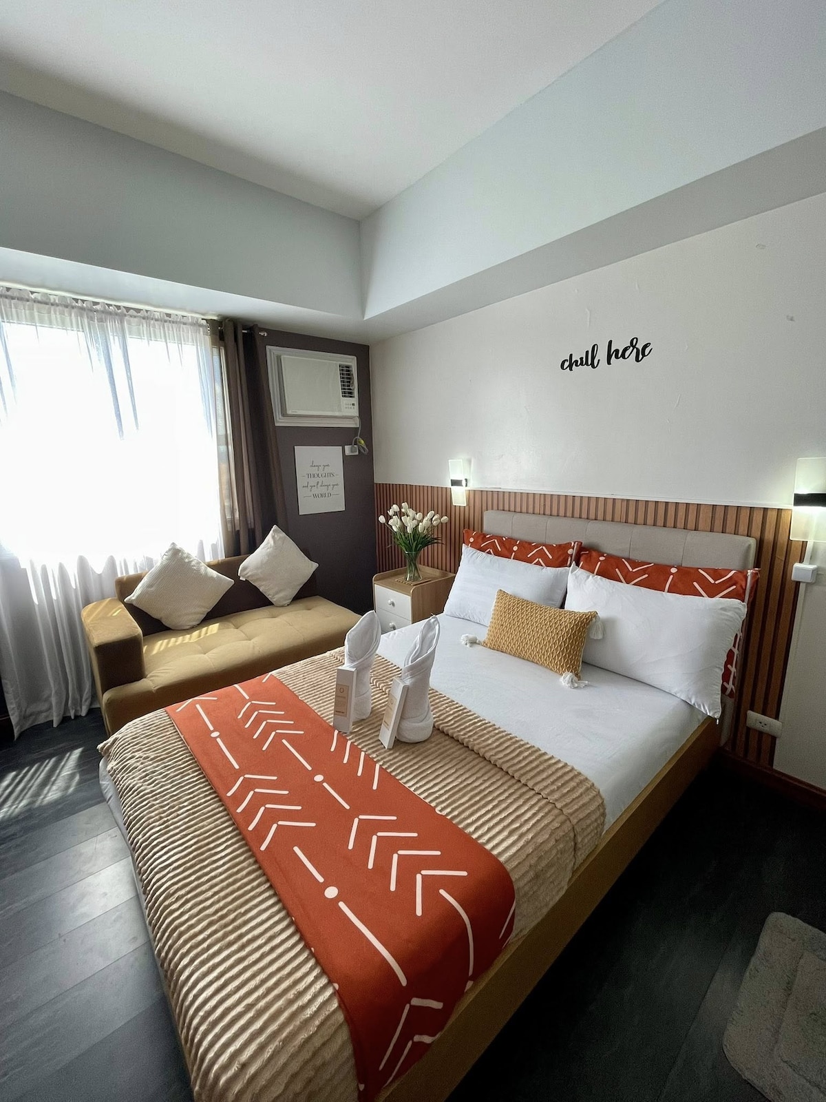 Relájate y desconecta en este cómodo y espacioso apartamento de un dormitorio en el corazón de la ciudad de Davao. Disfruta del elegante apartamento y de los servicios que incluye: Aparcamiento ✅ gratuito ✅ Wifi ilimitado. ✅ 2 televisores inteligentes con Netflix ✅ Lavadora y secadora ✅ Acogedor dormitorio con cama tamaño queen. Escritorio de✅ oficina con silla. ✅ Mesa de comedor y sillas de madera. Equipo de cocina✅ completo. ✅ microondas, dispensador de agua, arrocera, calentador de agua Y mucho más.