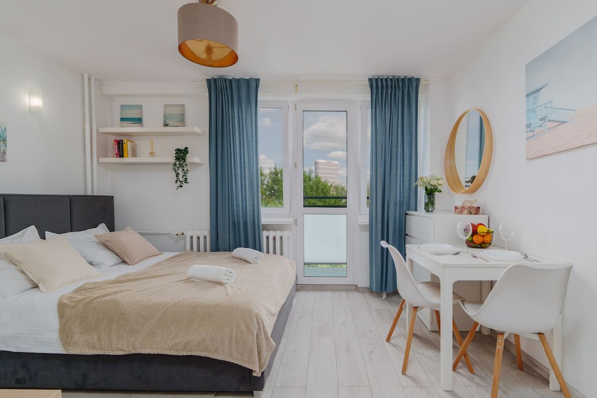 Apartamento cómodo y totalmente equipado en un edificio nuevo. Sala de estar con cocina abierta dividida en comedor y sala de estar. El dormitorio tiene una cama grande y un armario espacioso. También hay un armario como espacio de almacenamiento adicional. En la zona hay tiendas, restaurantes y cafeterías. Equipamiento: aire acondicionado, cafetera, hervidor de agua, plancha, tabla de planchar, lavadora Cómo llegar desde el aeropuerto de Chopin 20 minutos en taxi 50 minutos en transporte público desde el aeropuerto de Modlin 50 minutos en taxi 120 minutos en transporte público