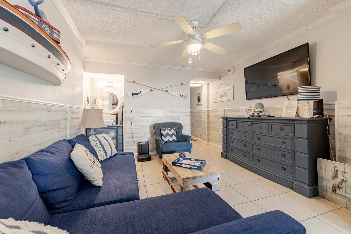 Relájate en esta escapada única y tranquila. Relájate en este espacio tranquilo y elegante en la playa. ¡La PISCINA es nueva y está ABIERTA! Disfruta de hermosas vistas al mar, ya que estás a solo unos pasos de la playa, el golf putt putt, las tiendas y los restaurantes. Este estudio recién renovado es la escapada perfecta. Pero tal vez su mejor característica es la vista al mar desde el balcón del sexto piso. El café y el amanecer son imprescindibles. Las características del centro vacacional incluyen un espacio de fitness y un espacio verde/parrilla.