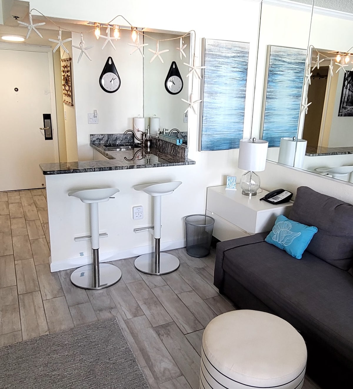 Apartamento tipo estudio frente al mar con una hermosa vista. Con amplio balcón compartido con asientos. La tarifa actual refleja las reparaciones y cierres continuos relacionados con las tormentas de algunos servicios. Ideal para huéspedes que valoran estar cerca de la playa y las vistas al mar sobre la perfección y la comprensión de los desafíos. Algunos abiertos recientemente: ** Servicios abiertos • 8:00 a. m. a 8:00 p. m. • Una piscina al aire libre. • Piscina cubierta • South Spa • Centro de fitness/ gimnasio. • Sauna ** Se requiere el registro del huésped principal con identificación a través del portal de huéspedes.