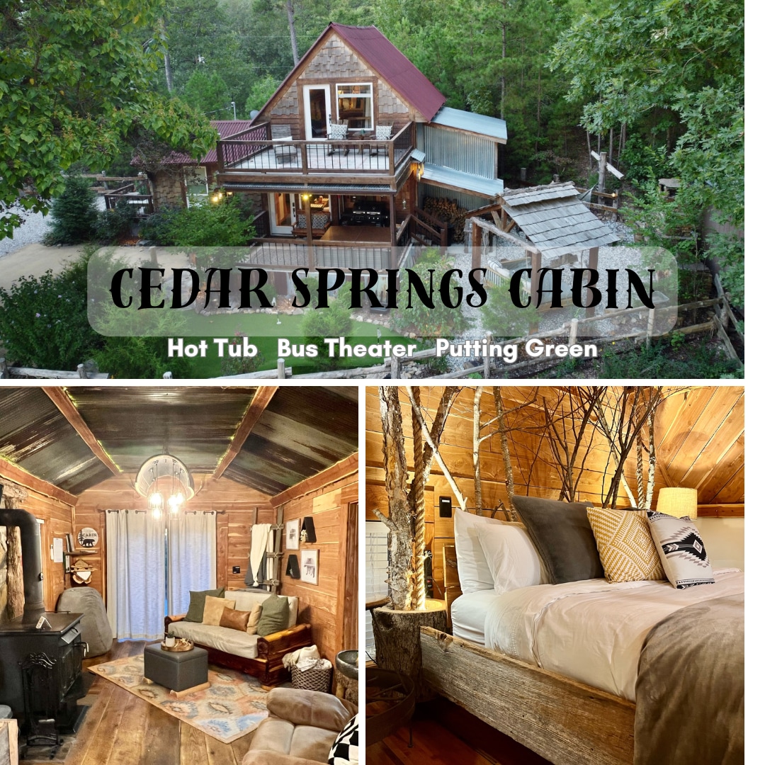 La cabaña Cedar Springs, ubicada a las afueras de la hermosa Hot Springs, Arkansas, es una experiencia única e irrepetible. Esta estructura bellamente diseñada es rústica, pero moderna. Disfruta de preciosas vistas desde el balcón superior o relájate abajo en la cama colgante personalizada al aire libre. La propiedad es perfecta para una escapada romántica en pareja, pero también es increíblemente familiar con la zona de juegos al aire libre y la sala de cine «autobús enterrado».