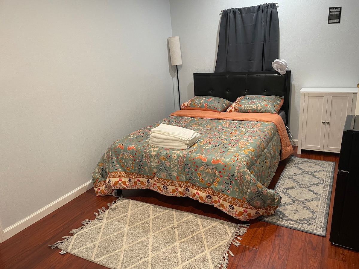 ¡Disfruta de una experiencia elegante en esta zona céntrica y codiciada de Modesto! A minutos de todo y a poca distancia a pie de muchas tiendas. Tendrás tu propia entrada privada, cocina pequeña (sin ESTUFA/HORNO), baño y dormitorio, ¡todo solo para ti! Ten en cuenta que esta unidad está adjunta a la casa principal de mi familia. Tenemos dos perros y mis vecinos también, por lo que el nivel de ruido no siempre es tranquilo. No dudes en ponerte en contacto con nosotros. Quiero que tu estancia sea lo más cómoda y fácil posible. *